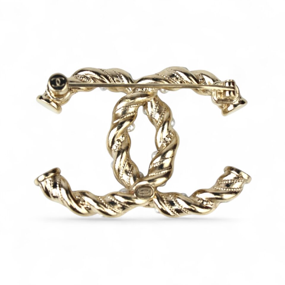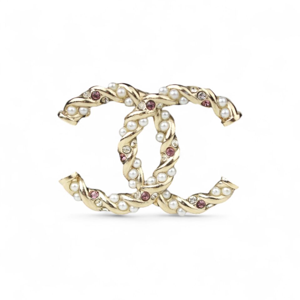Broche CC Chanel Torsade Métal Doré Strass Roses Perles
