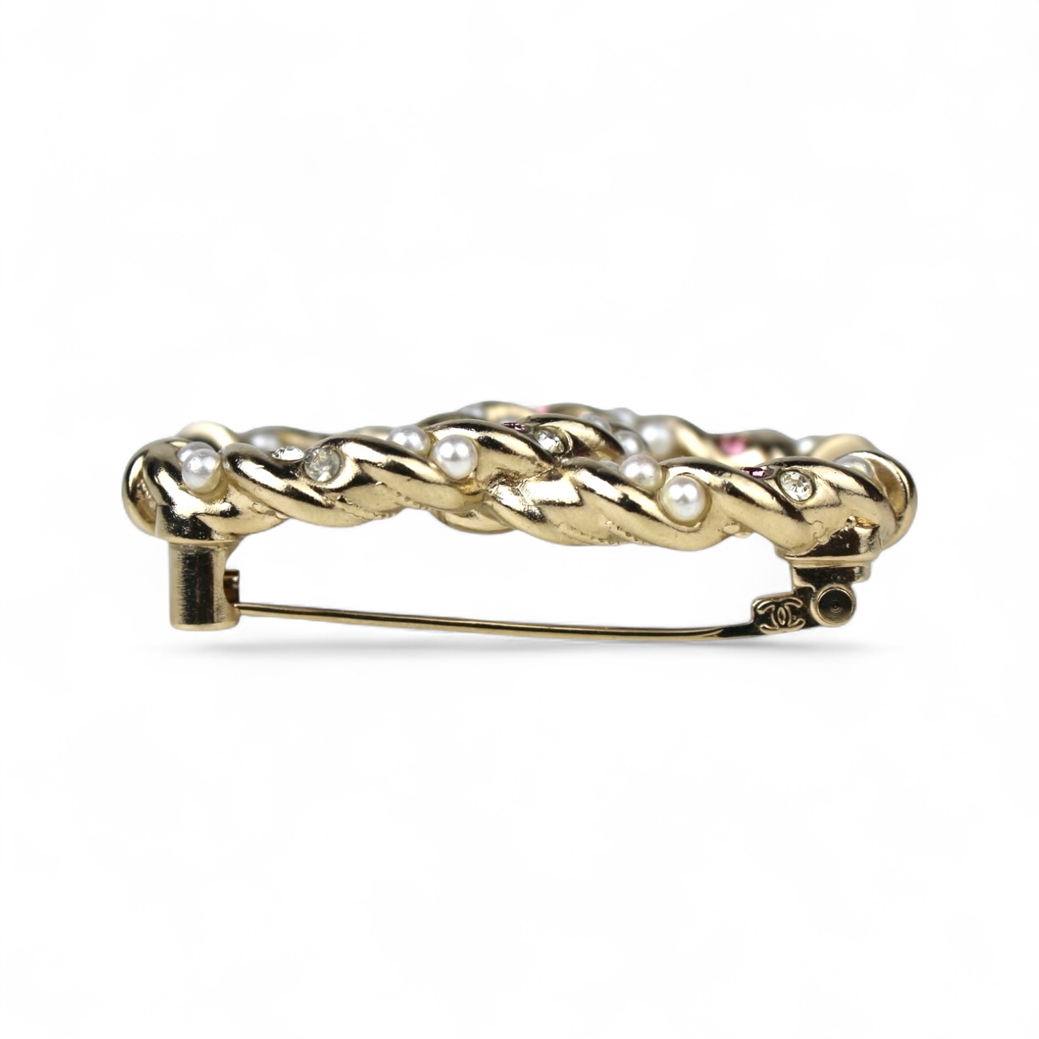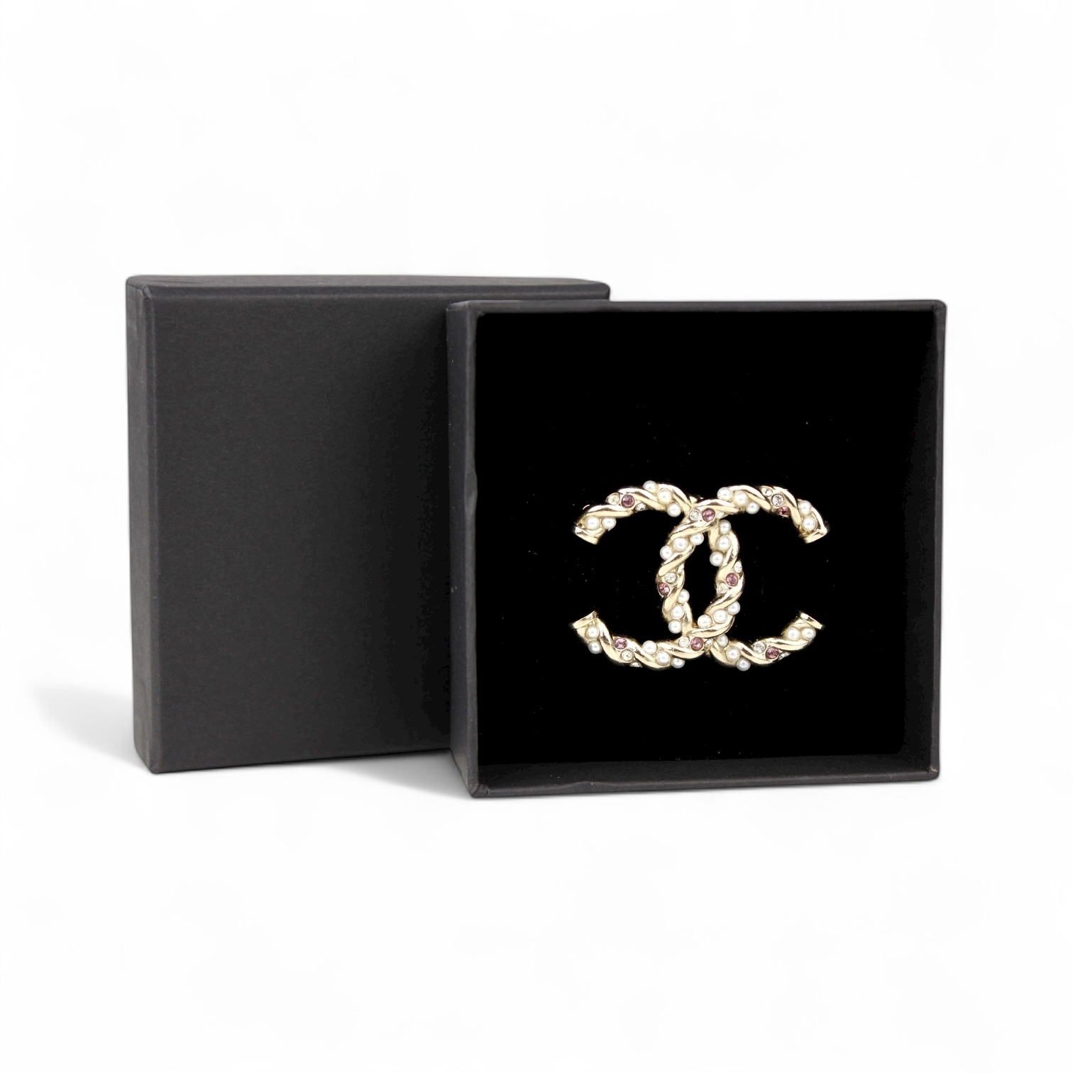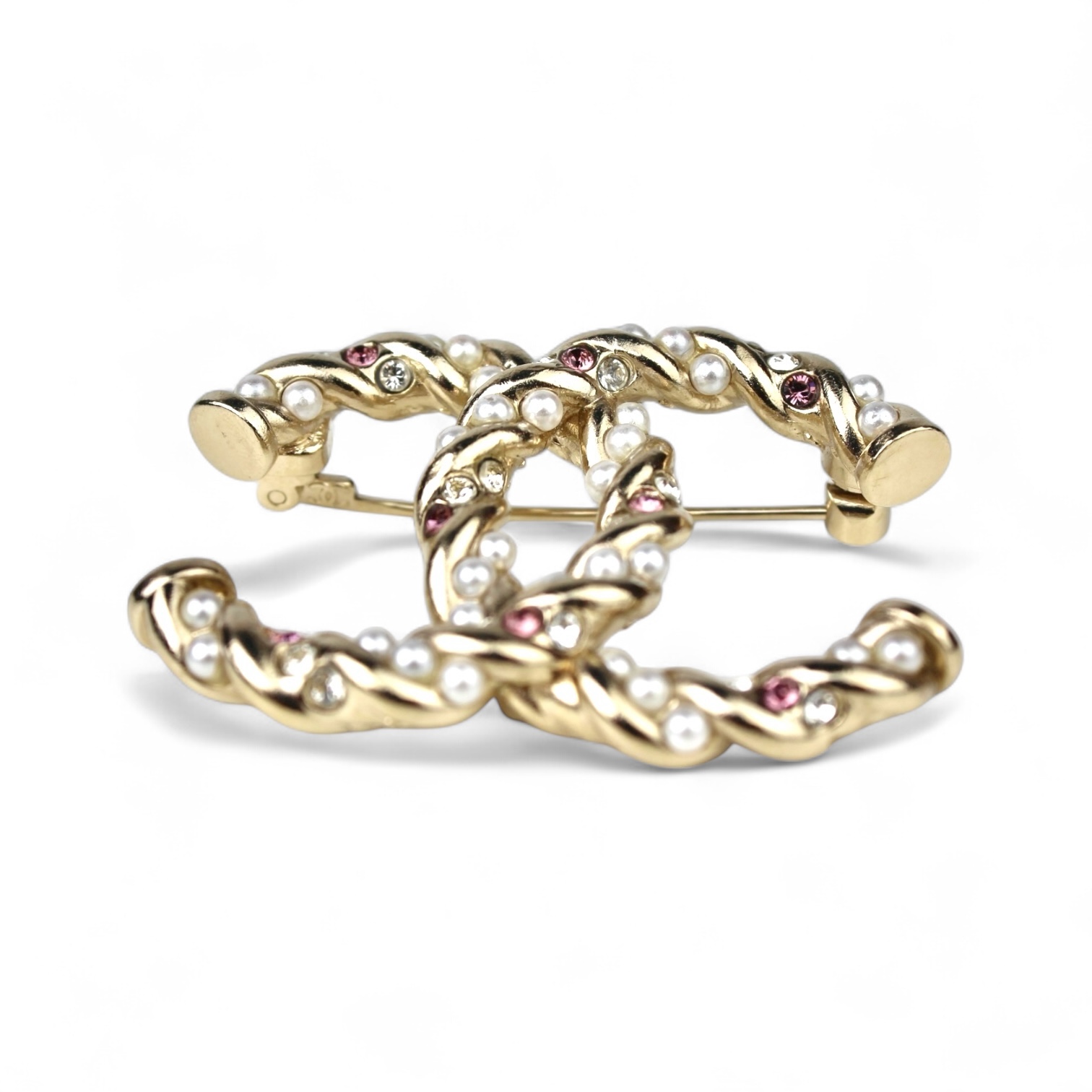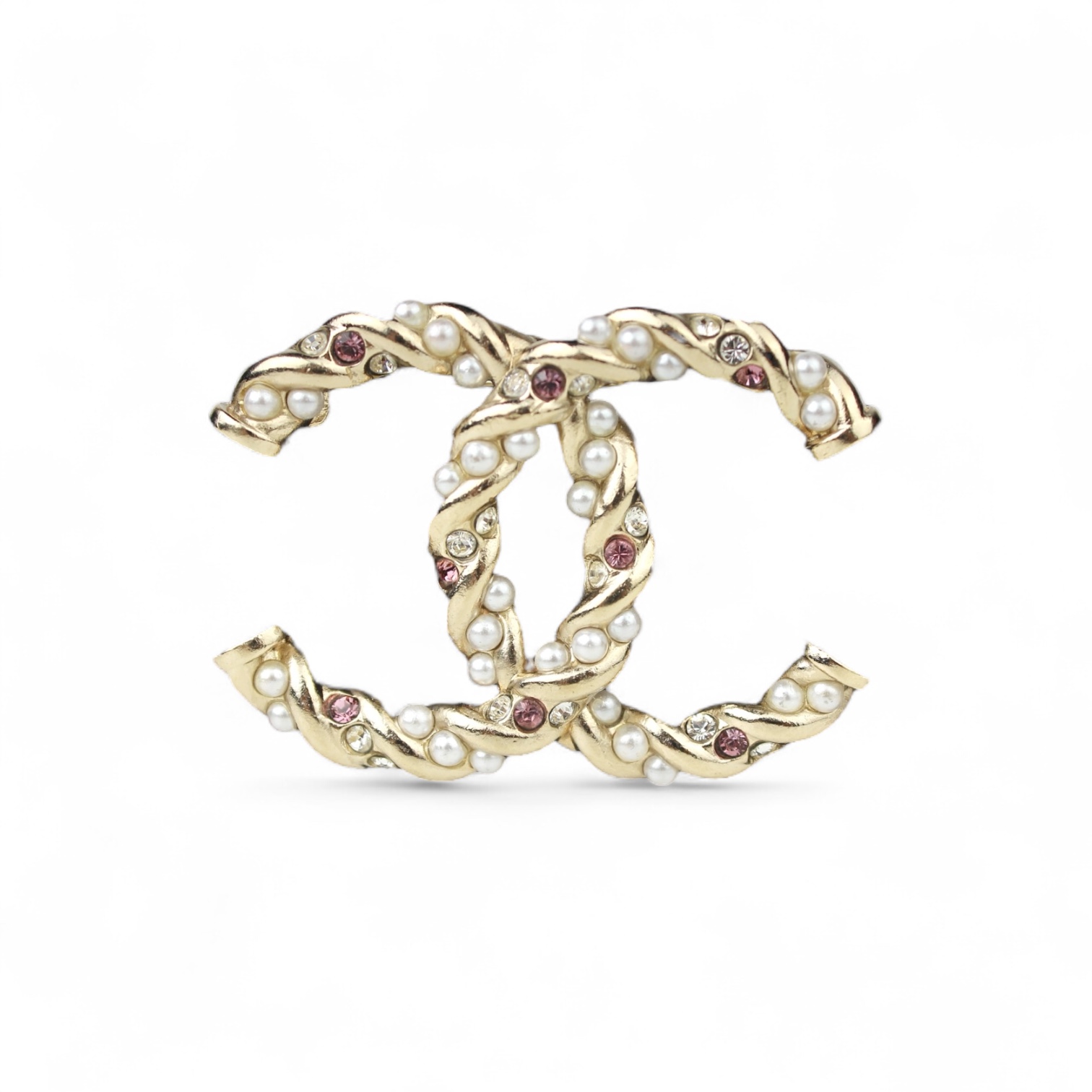 Élégante et précieuse, cette broche Chanel incarne le raffinement absolu de la Maison. Elle présente le logo iconique à double C entrelacés, revisité dans une version dorée texturée et délicatement sertie de perles blanches et de strass scintillants. Les cristaux roses et translucides apportent une touche de couleur subtile et féminine, tandis que les perles nacrées évoquent l’élégance intemporelle chère à Gabrielle Chanel.