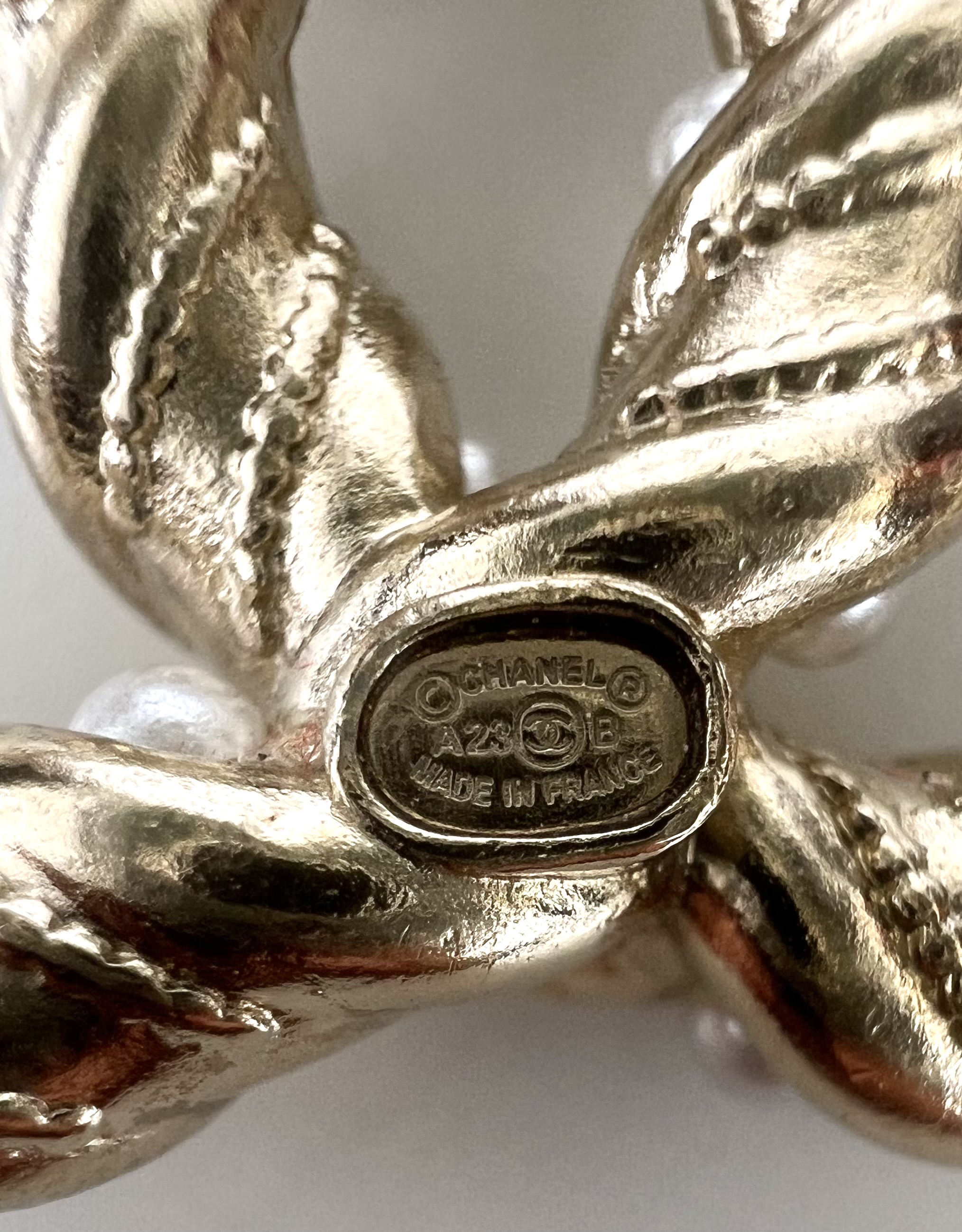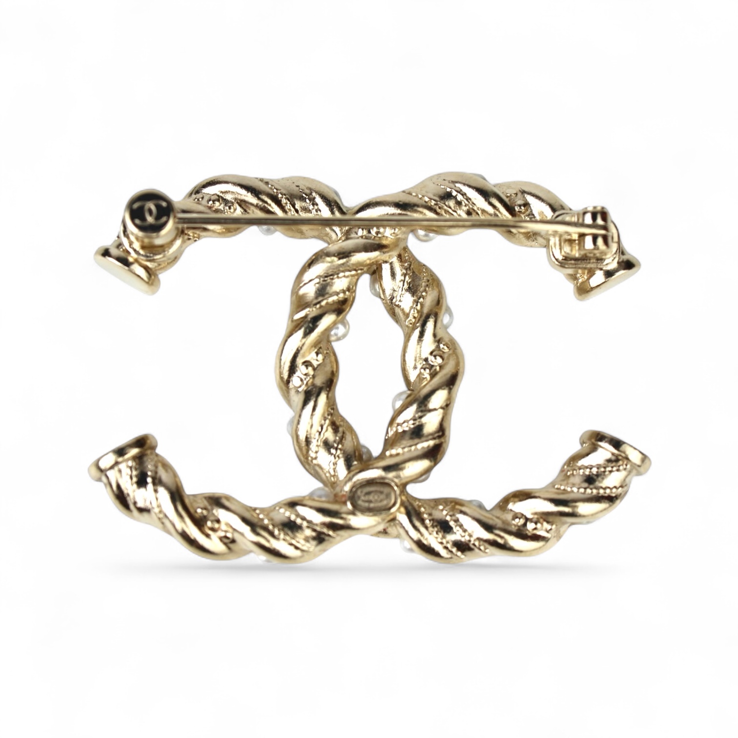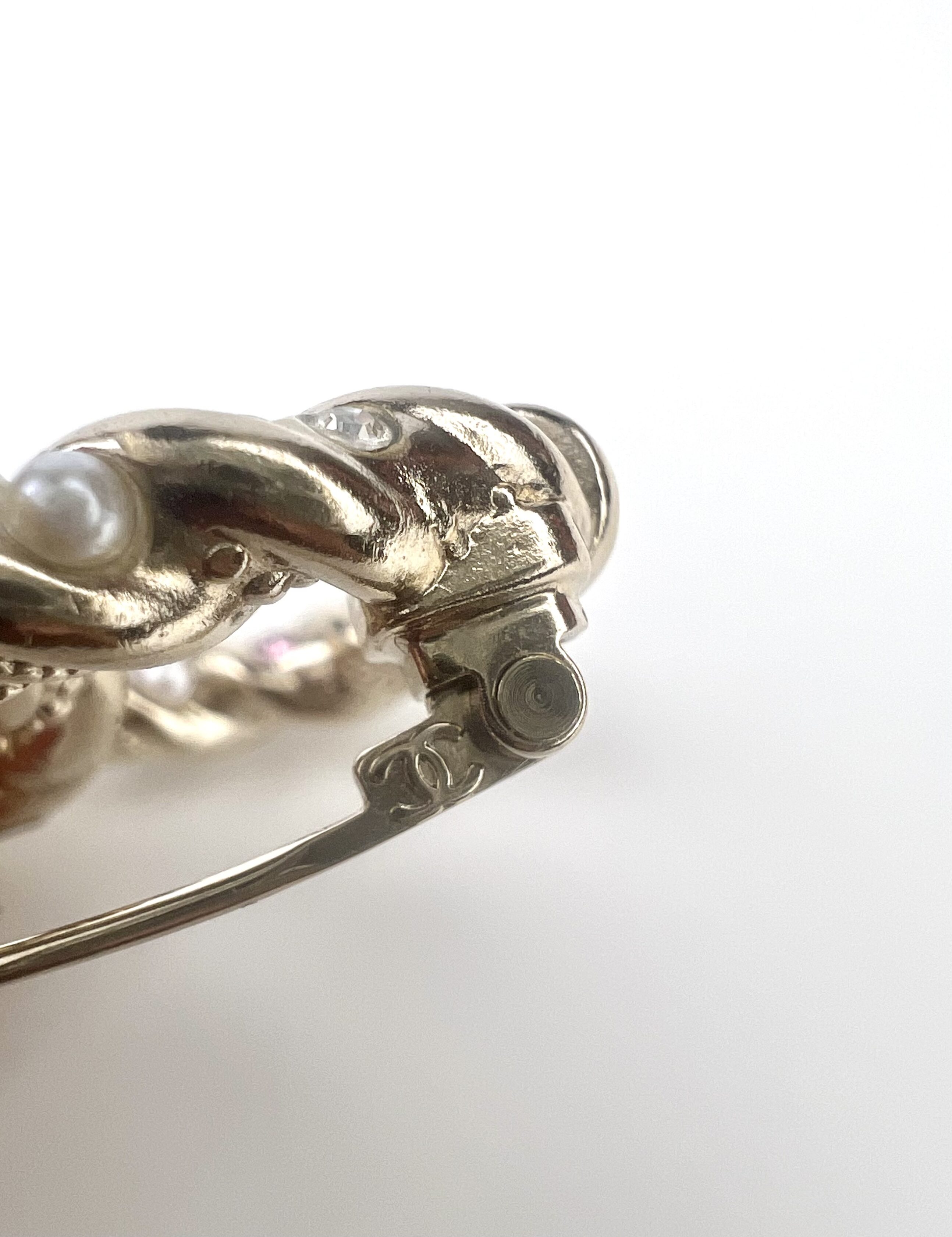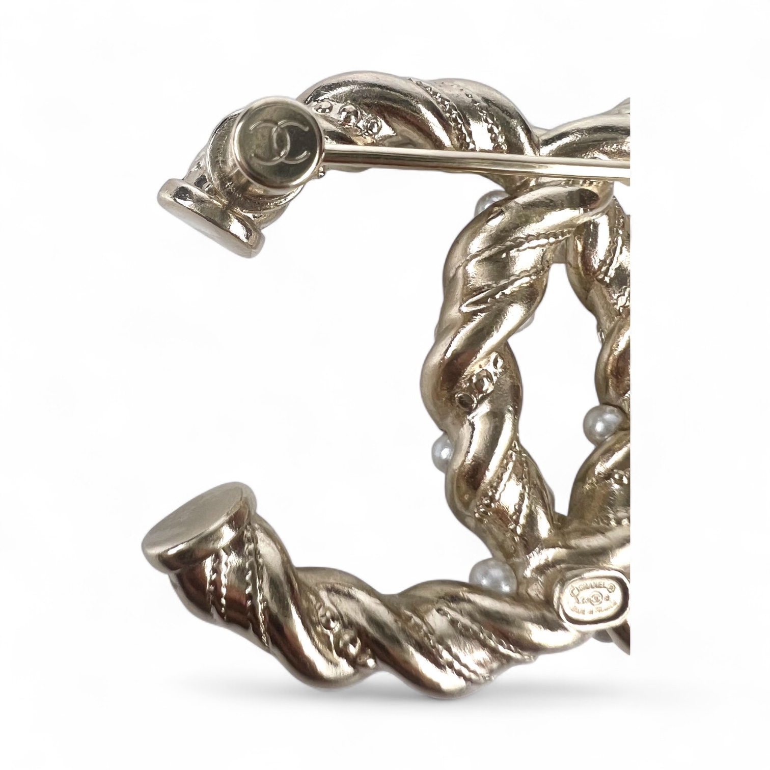 Élégante et précieuse, cette broche Chanel incarne le raffinement absolu de la Maison. Elle présente le logo iconique à double C entrelacés, revisité dans une version dorée texturée et délicatement sertie de perles blanches et de strass scintillants. Les cristaux roses et translucides apportent une touche de couleur subtile et féminine, tandis que les perles nacrées évoquent l’élégance intemporelle chère à Gabrielle Chanel.
