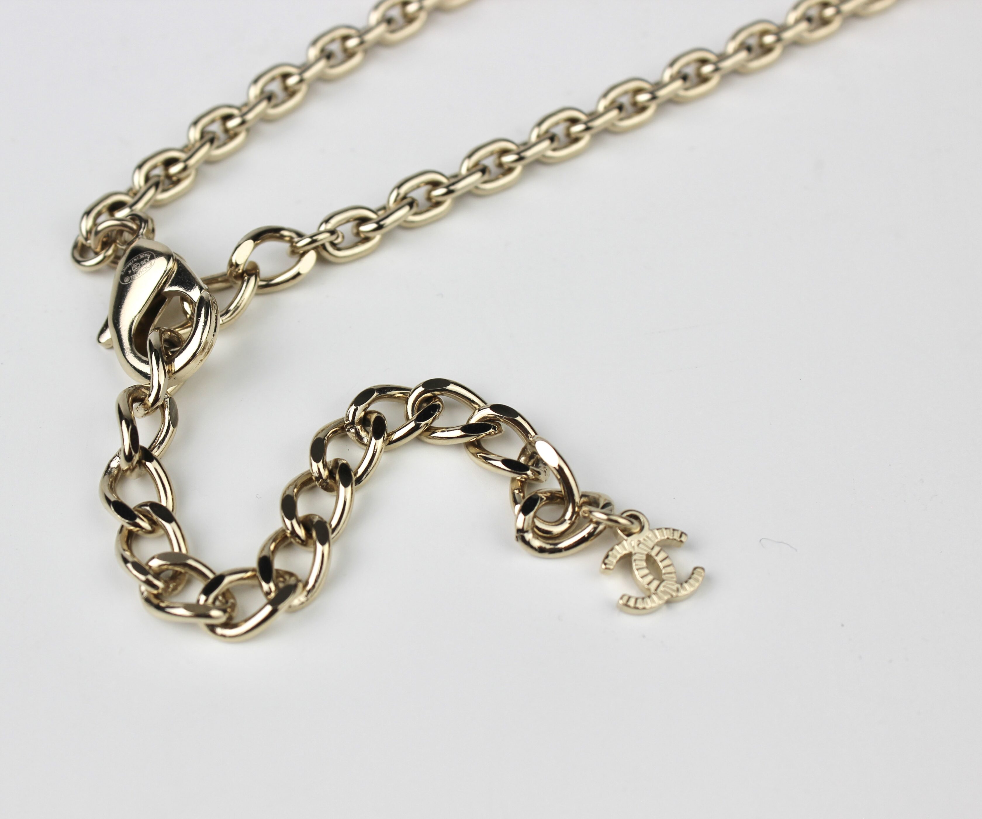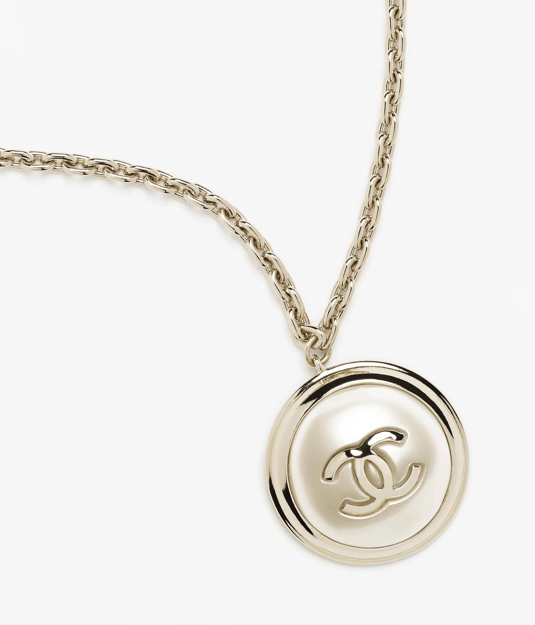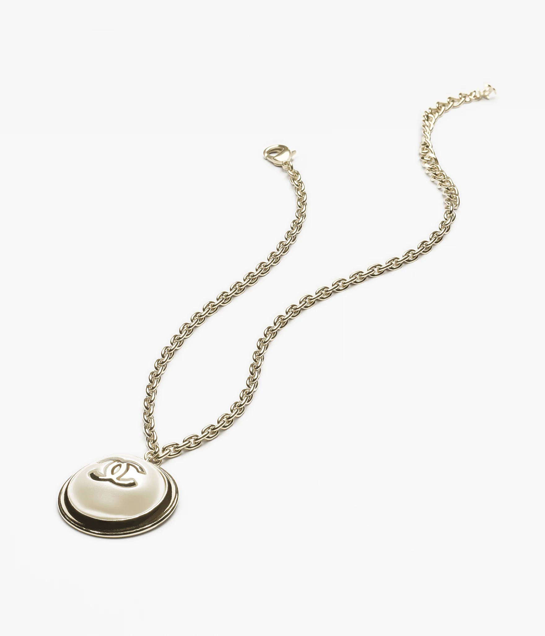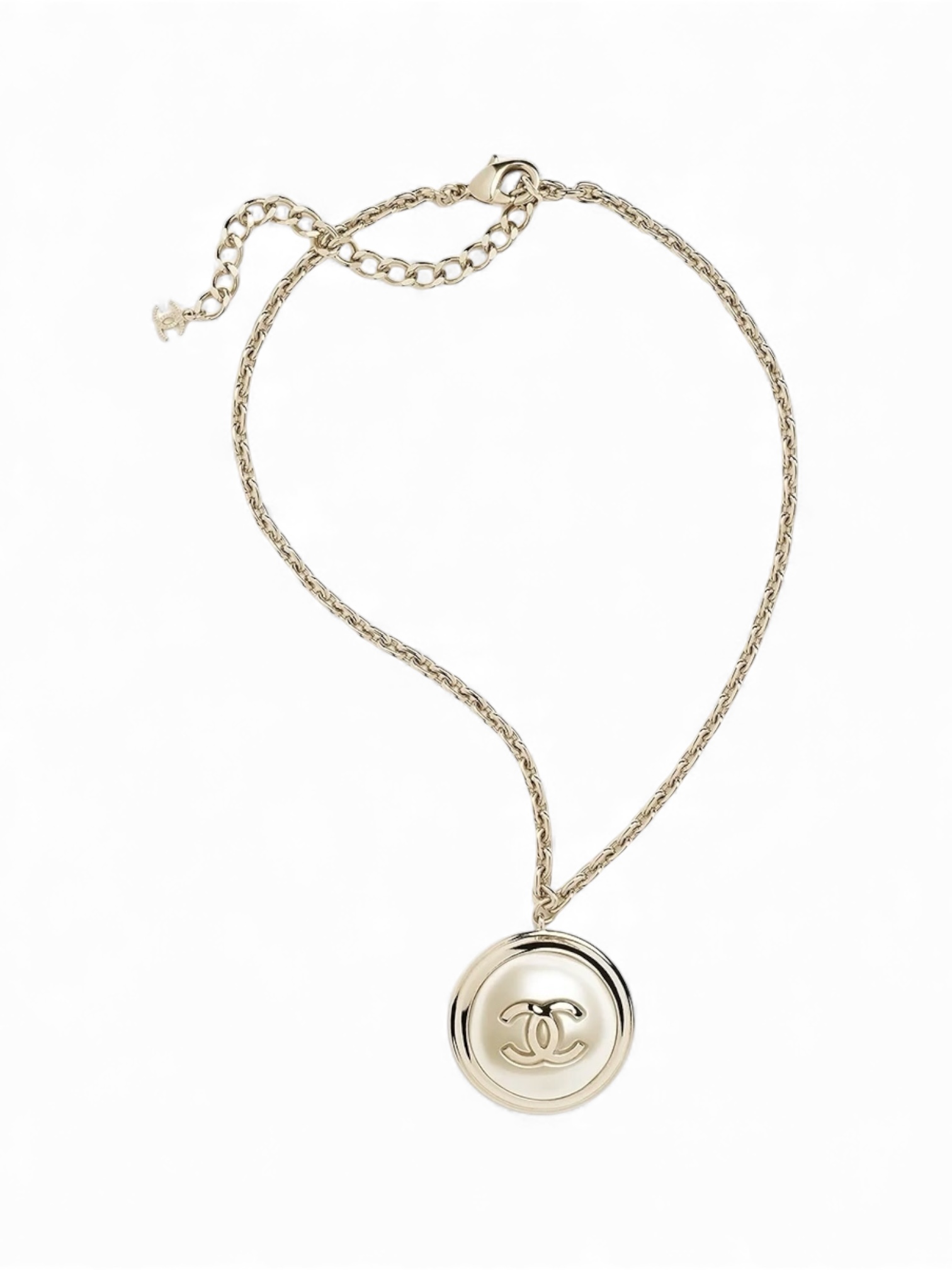 Ce collier élégant se compose d’une chaîne dorée au maillon fin et légèrement torsadé, offrant un aspect délicat et raffiné. Il est muni d’une chaînette d’extension permettant d’ajuster facilement la longueur. Au centre, un pendentif rond en métal doré poli arbore fièrement le célèbre logo entrelacé « CC » de la maison Chanel. L’ensemble dégage une allure luxueuse et intemporelle, mêlant simplicité des lignes et sophistication iconique.