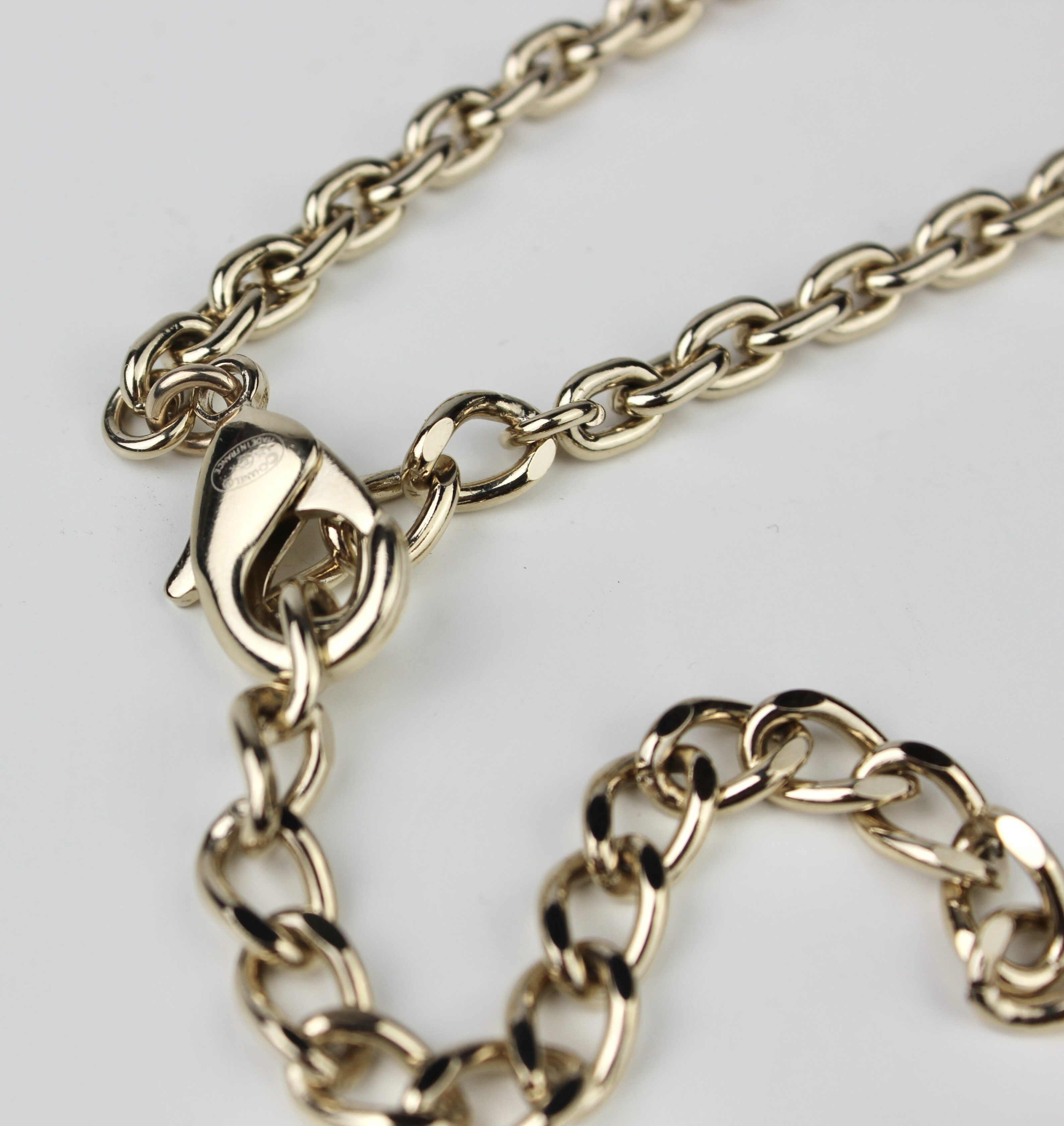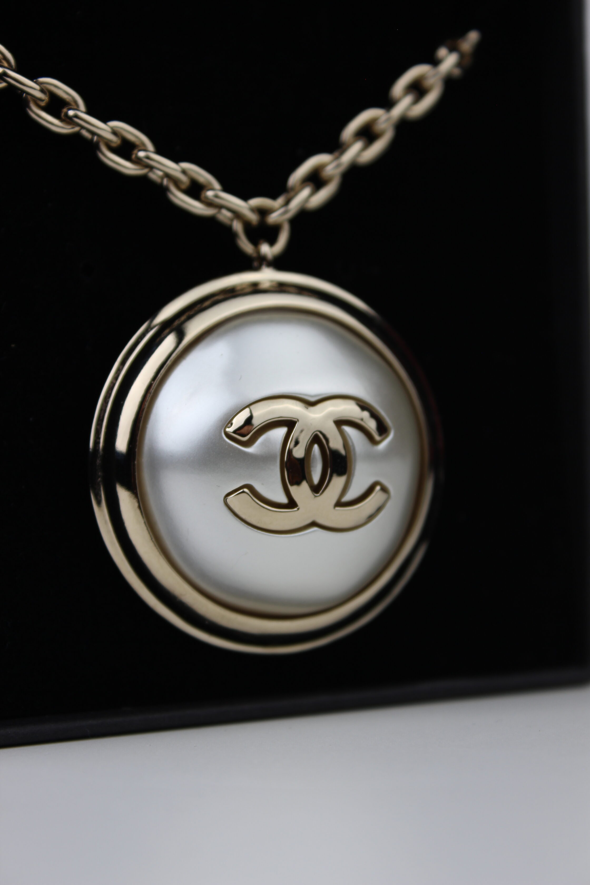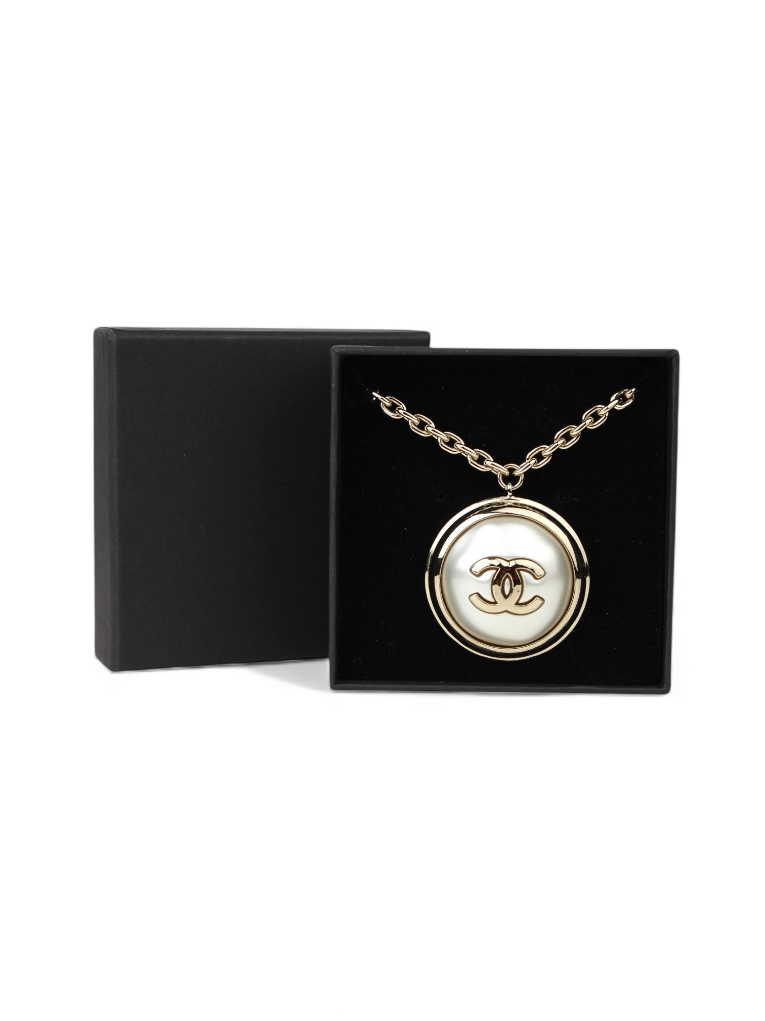 Ce collier élégant se compose d’une chaîne dorée au maillon fin et légèrement torsadé, offrant un aspect délicat et raffiné. Il est muni d’une chaînette d’extension permettant d’ajuster facilement la longueur. Au centre, un pendentif rond en métal doré poli arbore fièrement le célèbre logo entrelacé « CC » de la maison Chanel. L’ensemble dégage une allure luxueuse et intemporelle, mêlant simplicité des lignes et sophistication iconique.