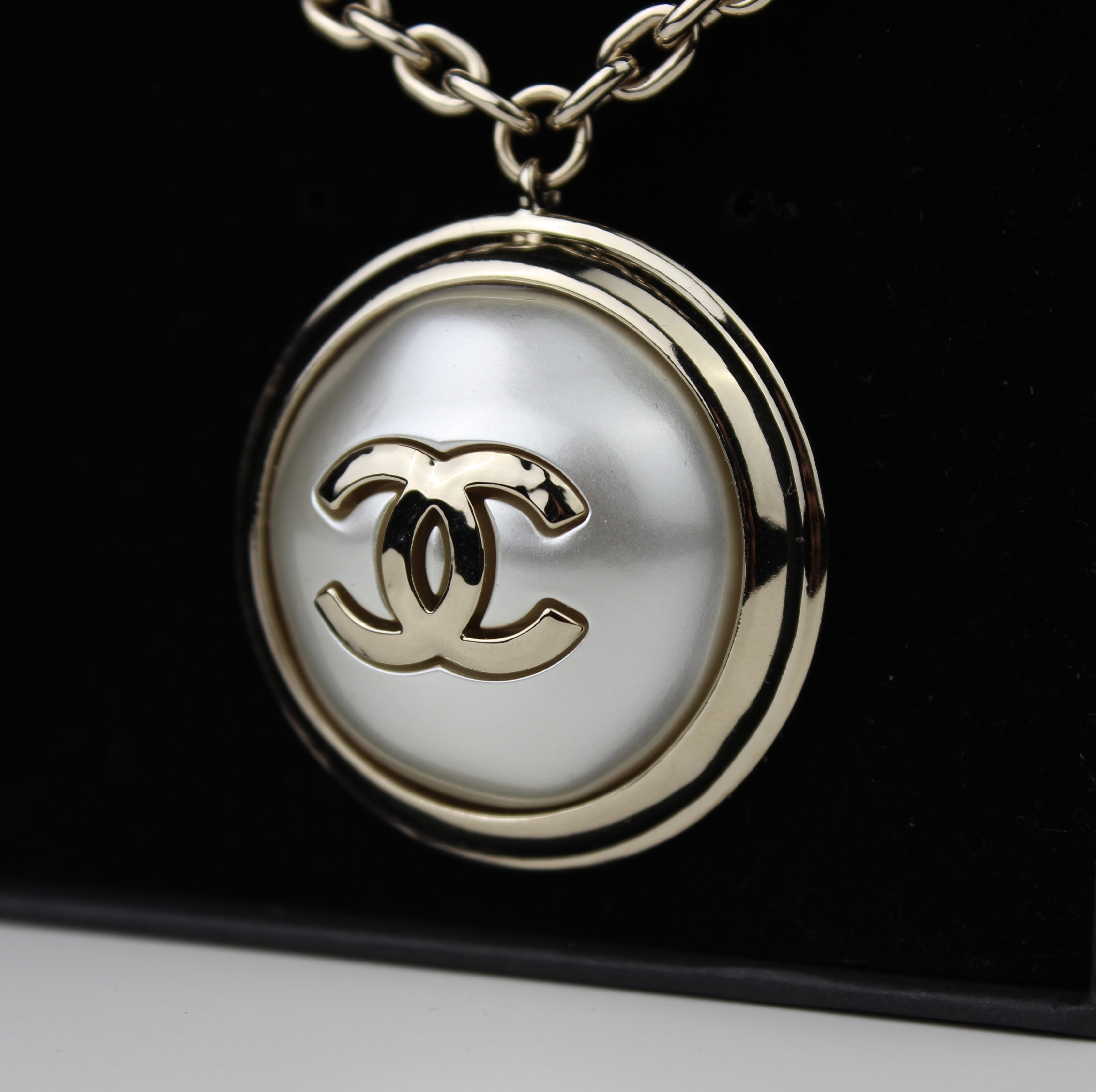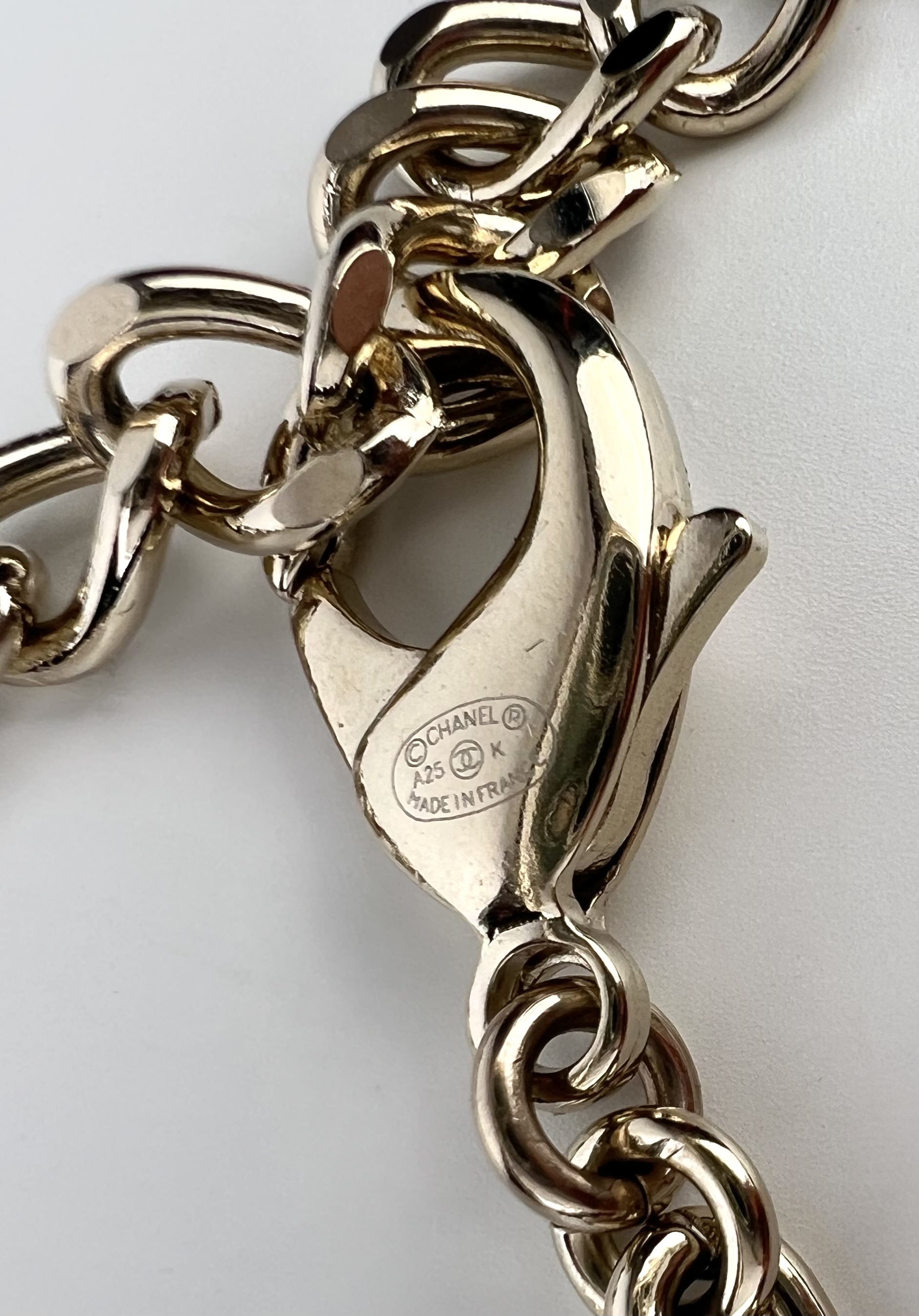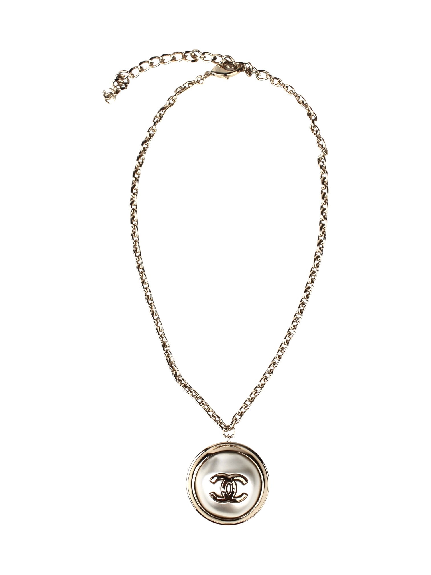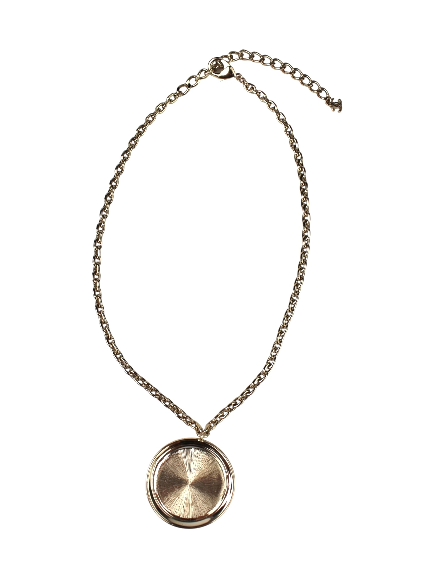 Ce collier élégant se compose d’une chaîne dorée au maillon fin et légèrement torsadé, offrant un aspect délicat et raffiné. Il est muni d’une chaînette d’extension permettant d’ajuster facilement la longueur. Au centre, un pendentif rond en métal doré poli arbore fièrement le célèbre logo entrelacé « CC » de la maison Chanel. L’ensemble dégage une allure luxueuse et intemporelle, mêlant simplicité des lignes et sophistication iconique.