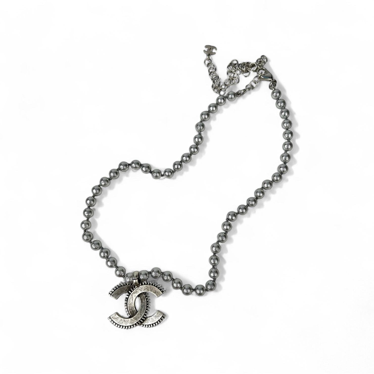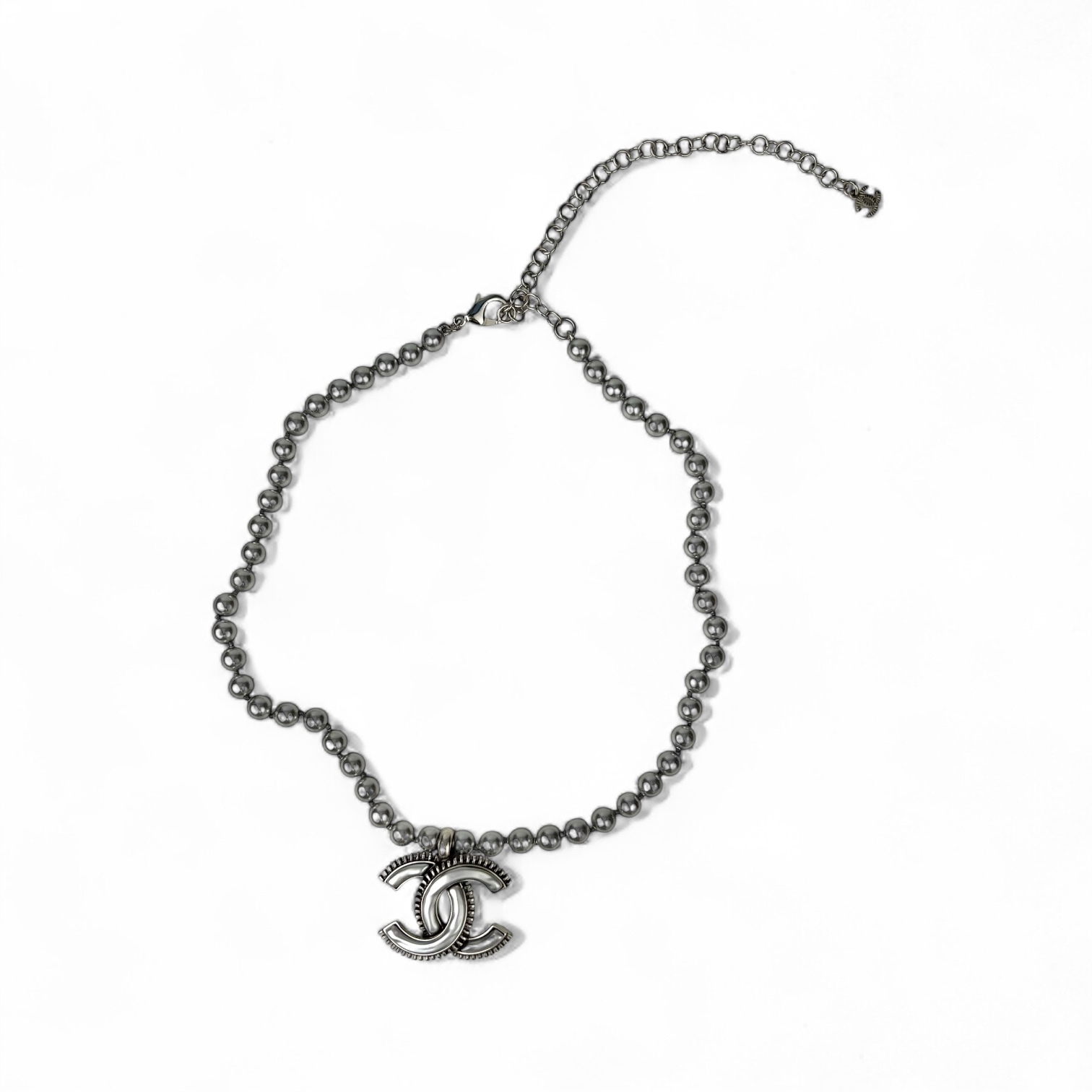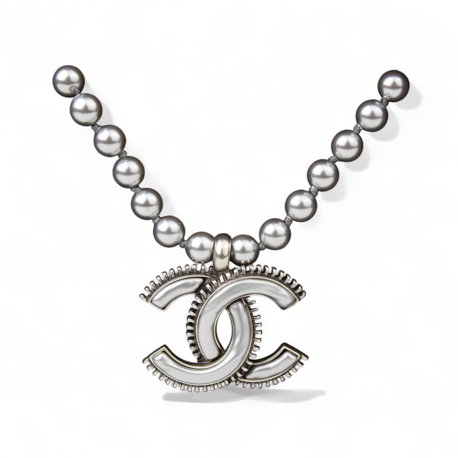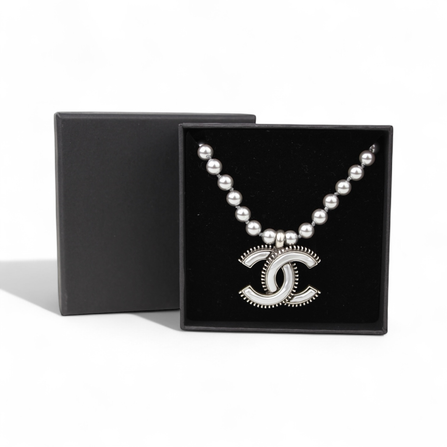 Ce somptueux collier Chanel en perles argentées se distingue par son pendentif emblématique à double C entrelacés et ses détails finement ciselés. Doté d’un fermoir réglable, ce bijou conjugue élégance, confort et raffinement, il se porte aussi bien pour une allure chic de jour qu’un style sophistiqué en soirée.