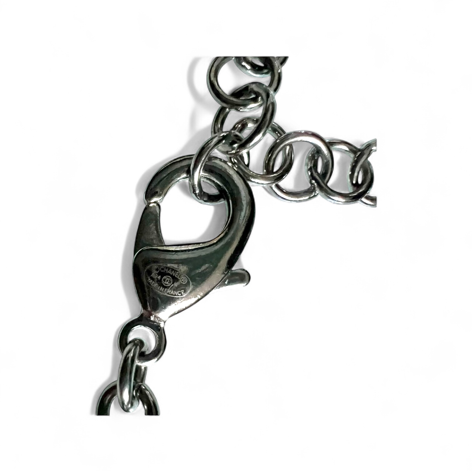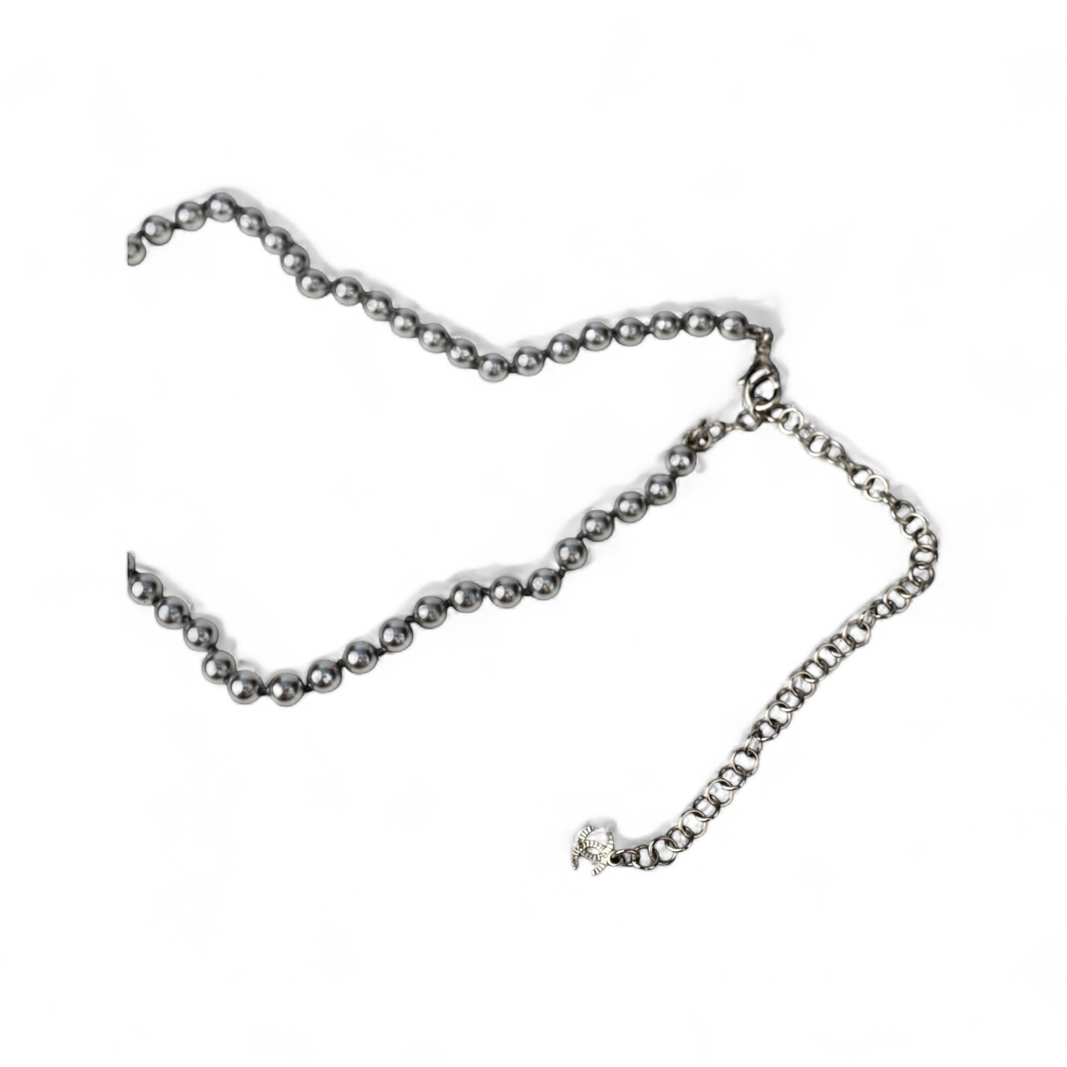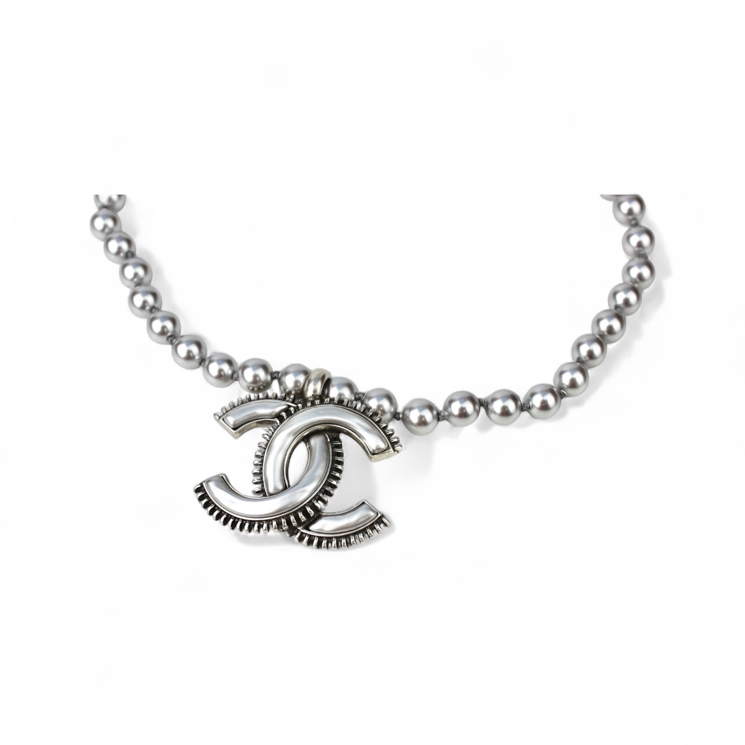 Ce somptueux collier Chanel en perles argentées se distingue par son pendentif emblématique à double C entrelacés et ses détails finement ciselés. Doté d’un fermoir réglable, ce bijou conjugue élégance, confort et raffinement, il se porte aussi bien pour une allure chic de jour qu’un style sophistiqué en soirée.