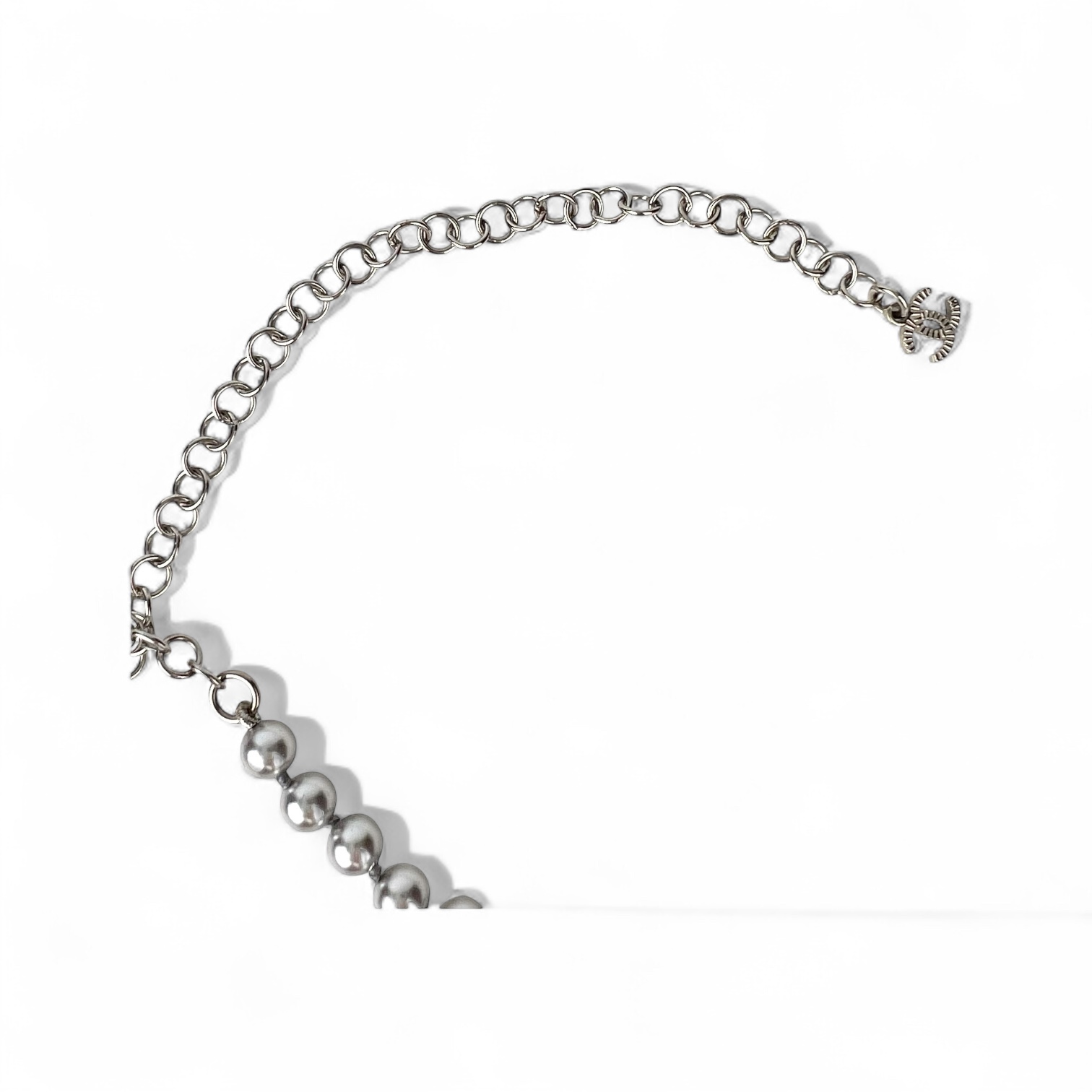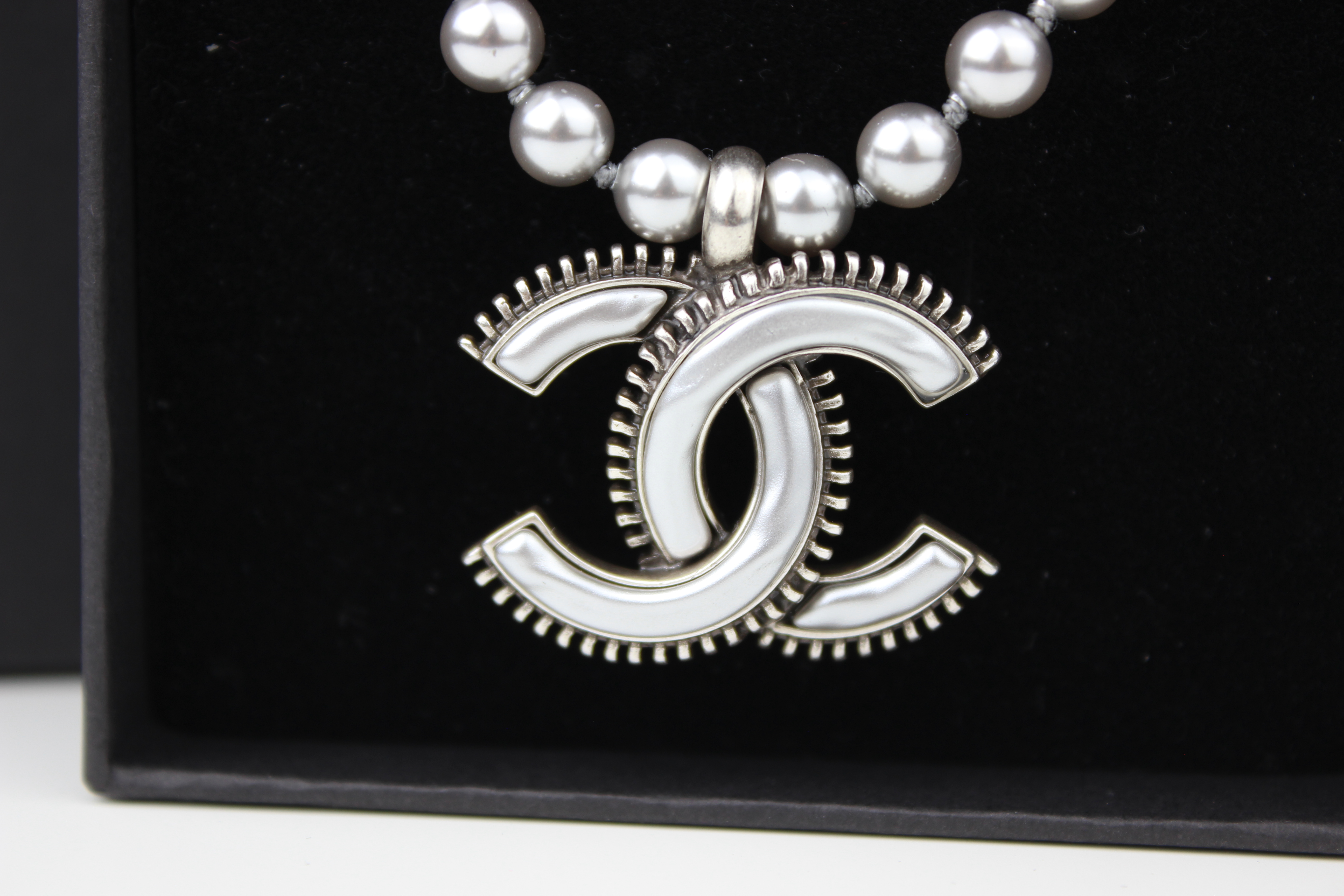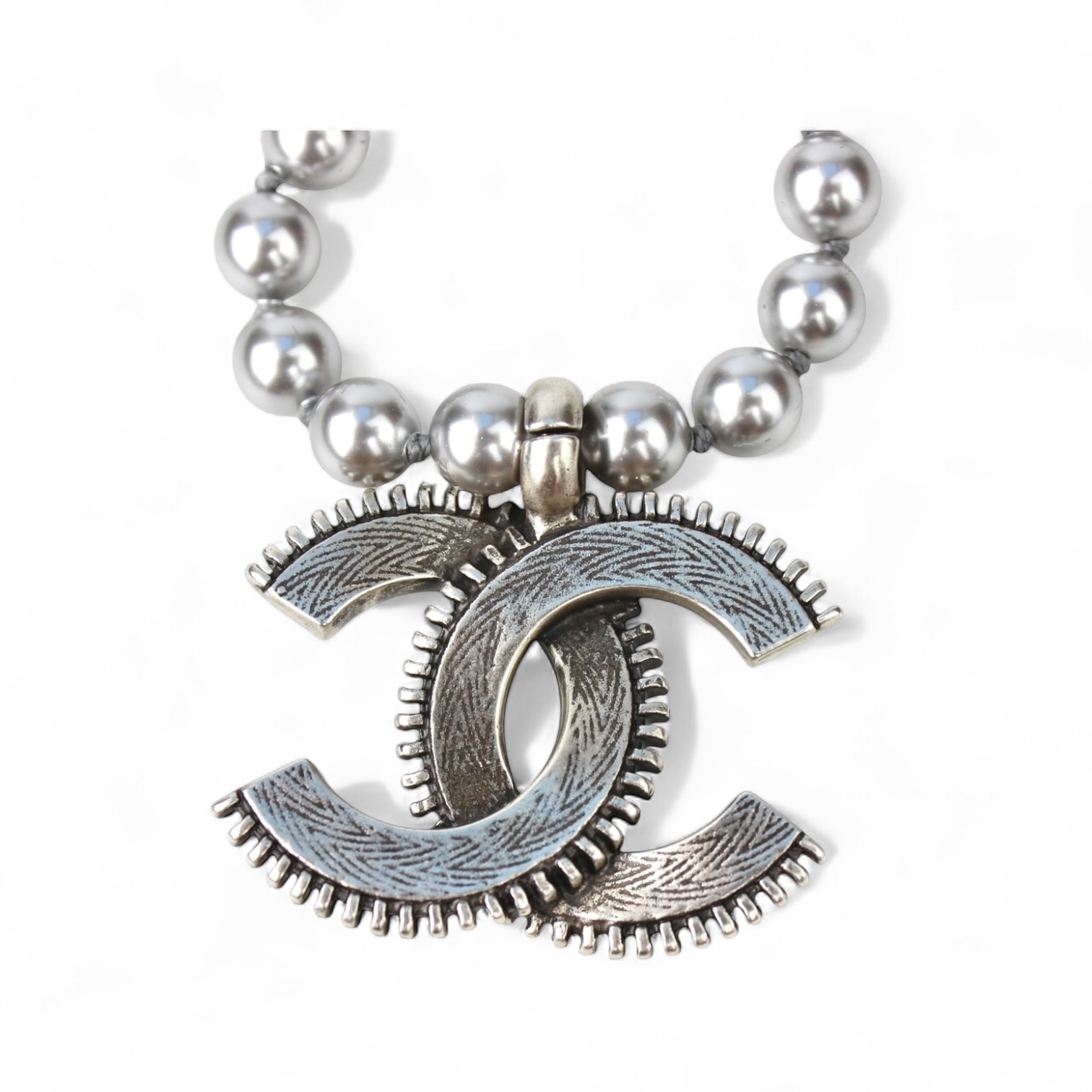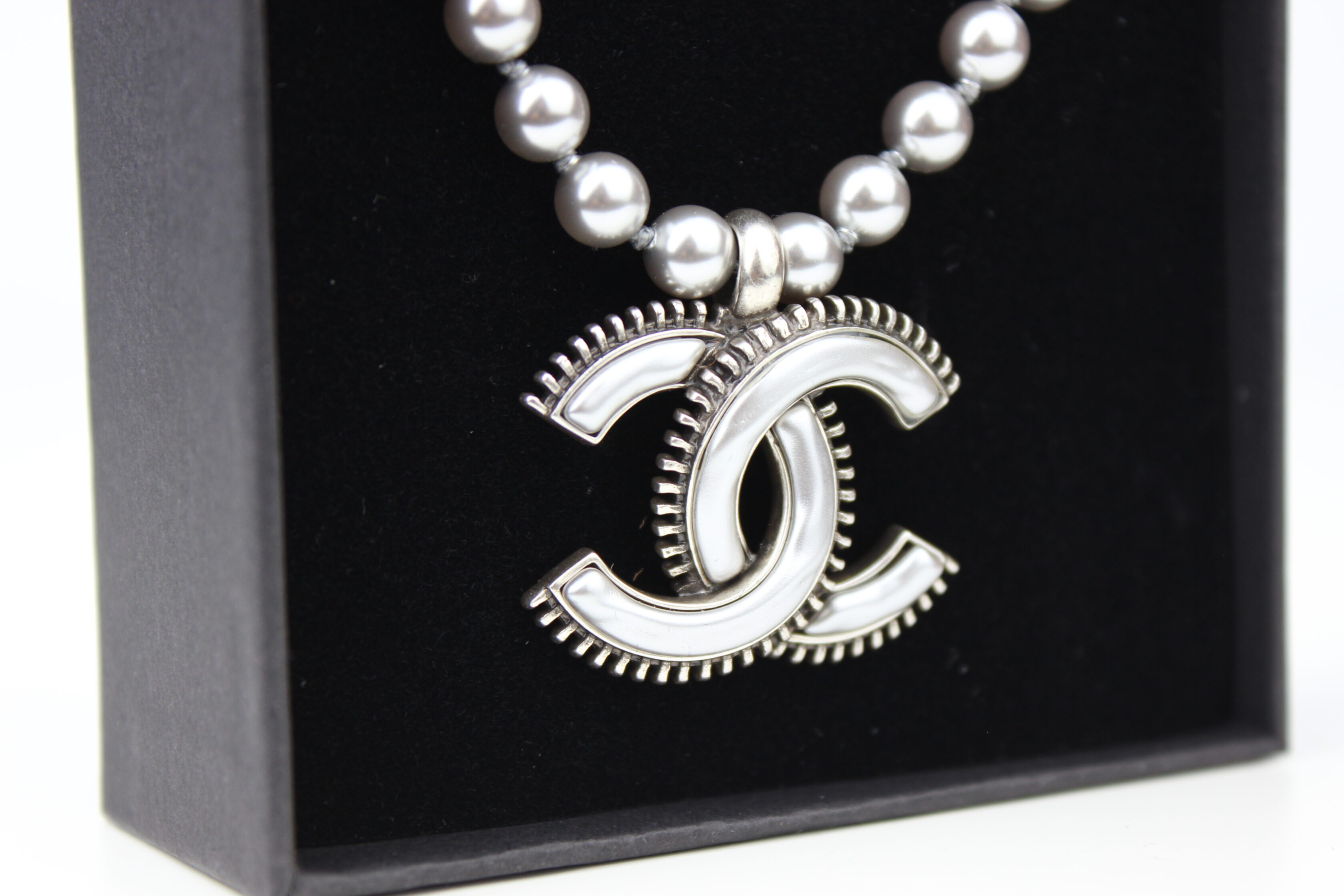 Ce somptueux collier Chanel en perles argentées se distingue par son pendentif emblématique à double C entrelacés et ses détails finement ciselés. Doté d’un fermoir réglable, ce bijou conjugue élégance, confort et raffinement, il se porte aussi bien pour une allure chic de jour qu’un style sophistiqué en soirée.
