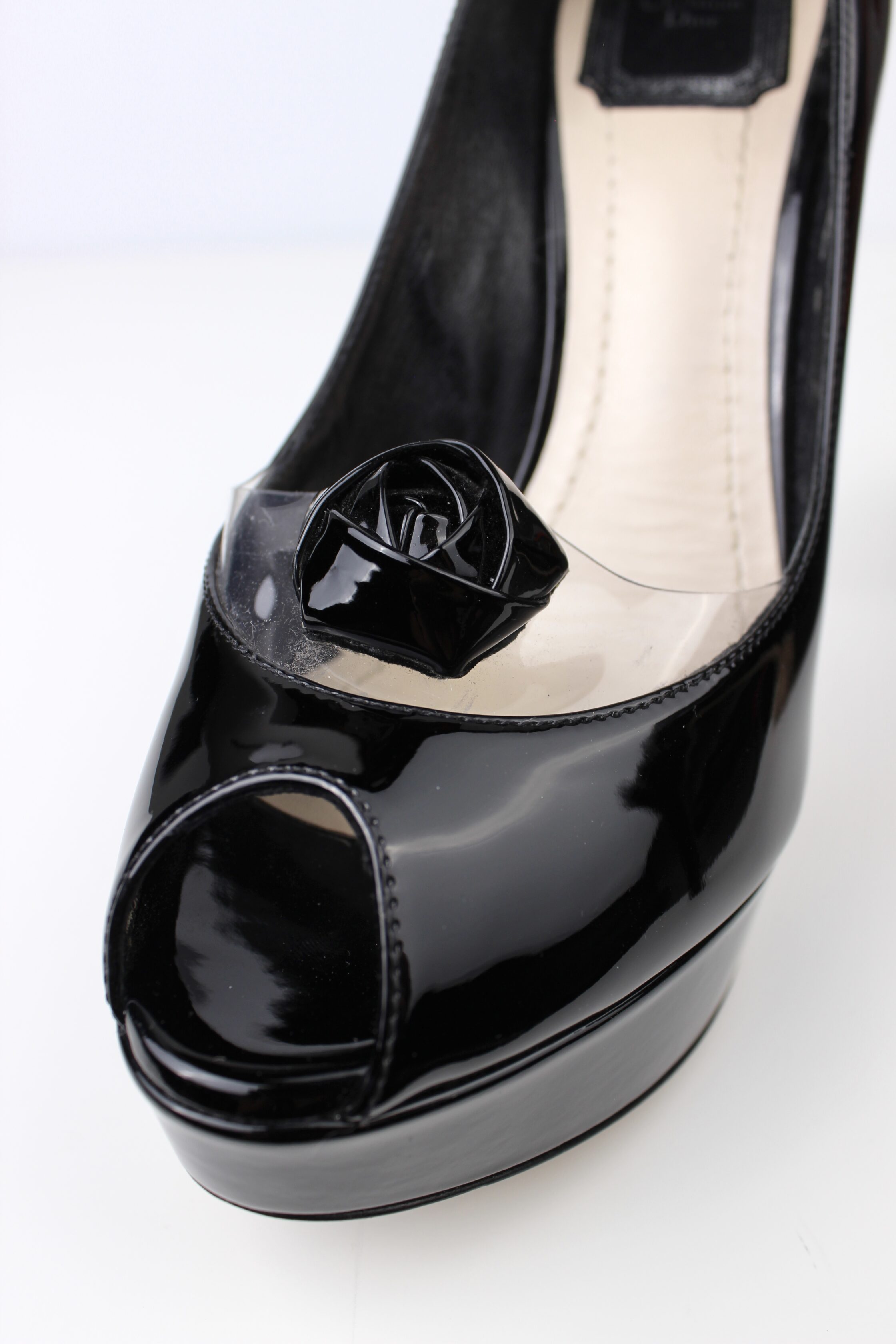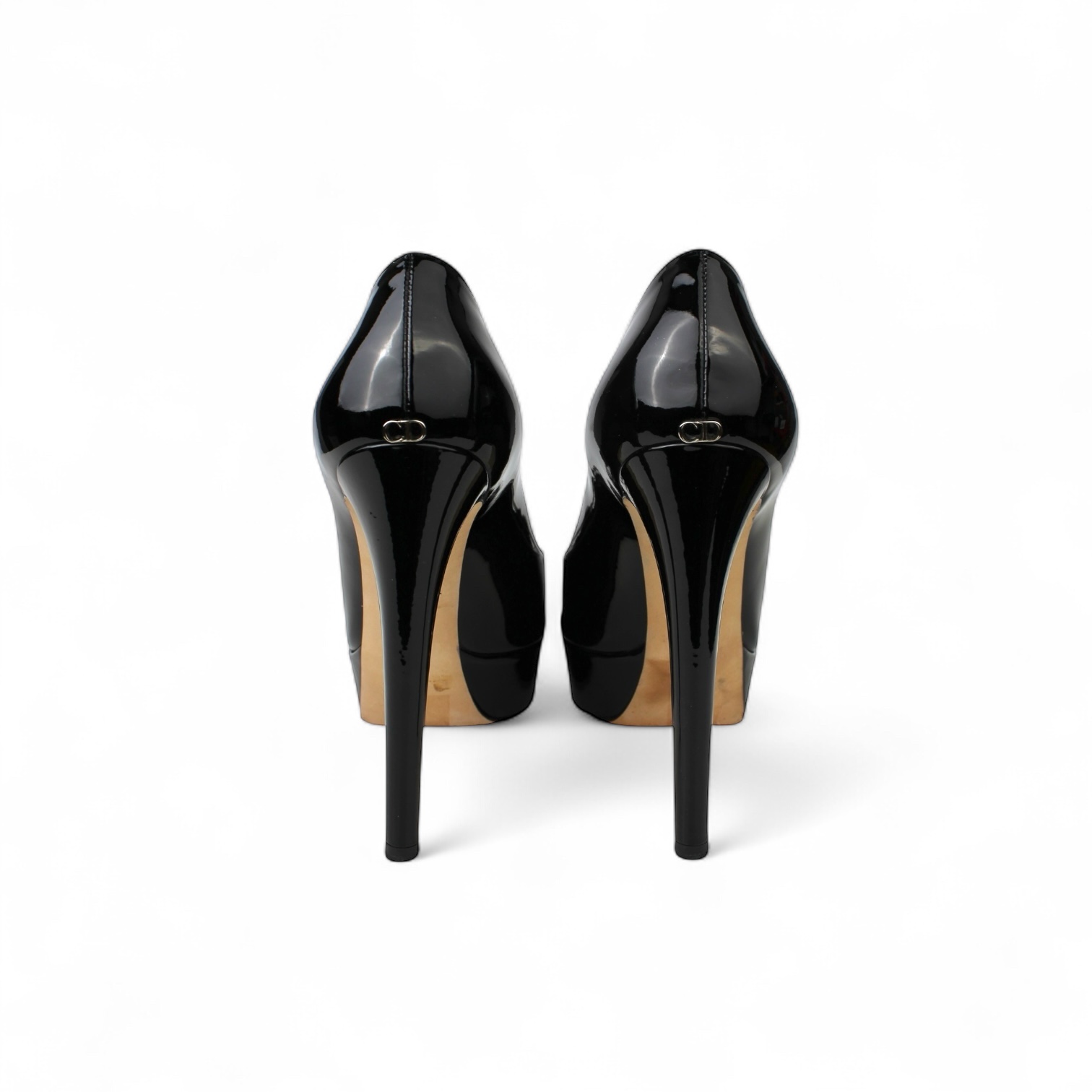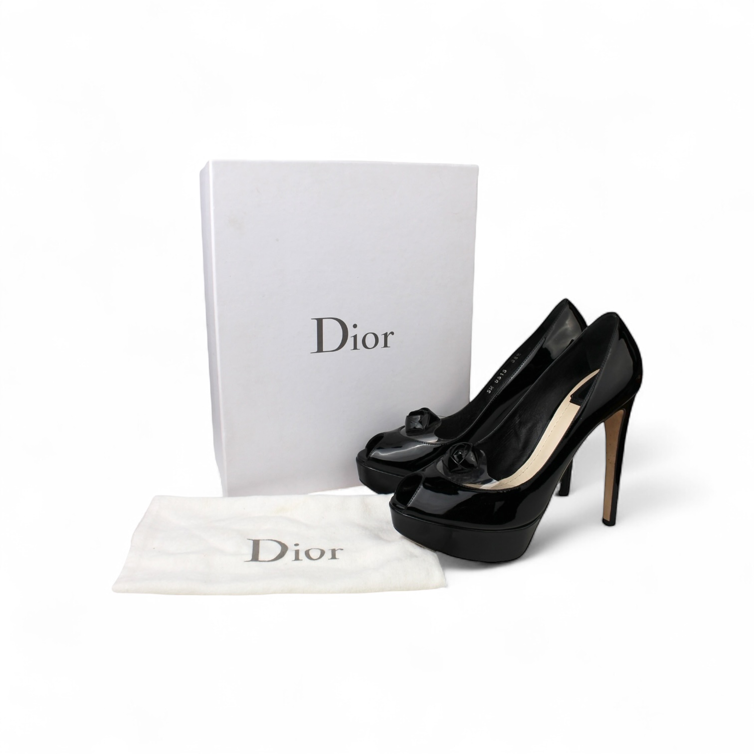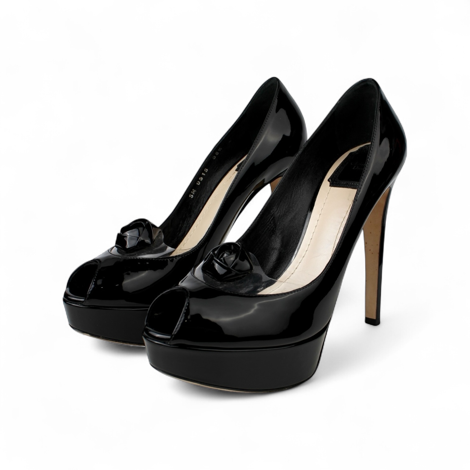 Escarpins Christian Dior en cuir verni noir, à bout ouvert (peep-toe) avec plateforme et talons hauts élancés. Ornés d’un petit détail en forme de fleur sur l’avant, ils allient élégance et féminité. Le cuir brillant apporte une touche sophistiquée, idéale pour une tenue de soirée ou une occasion habillée.