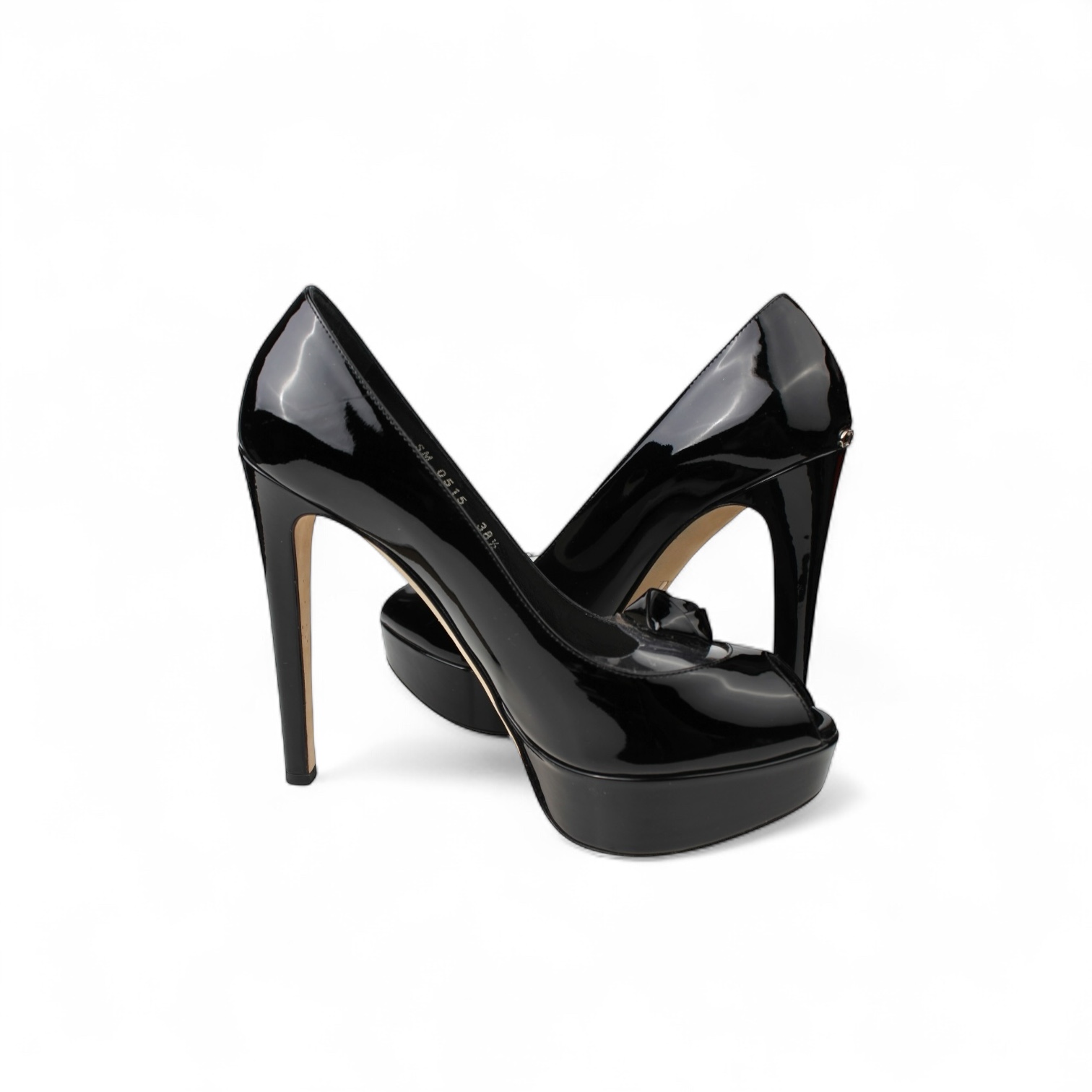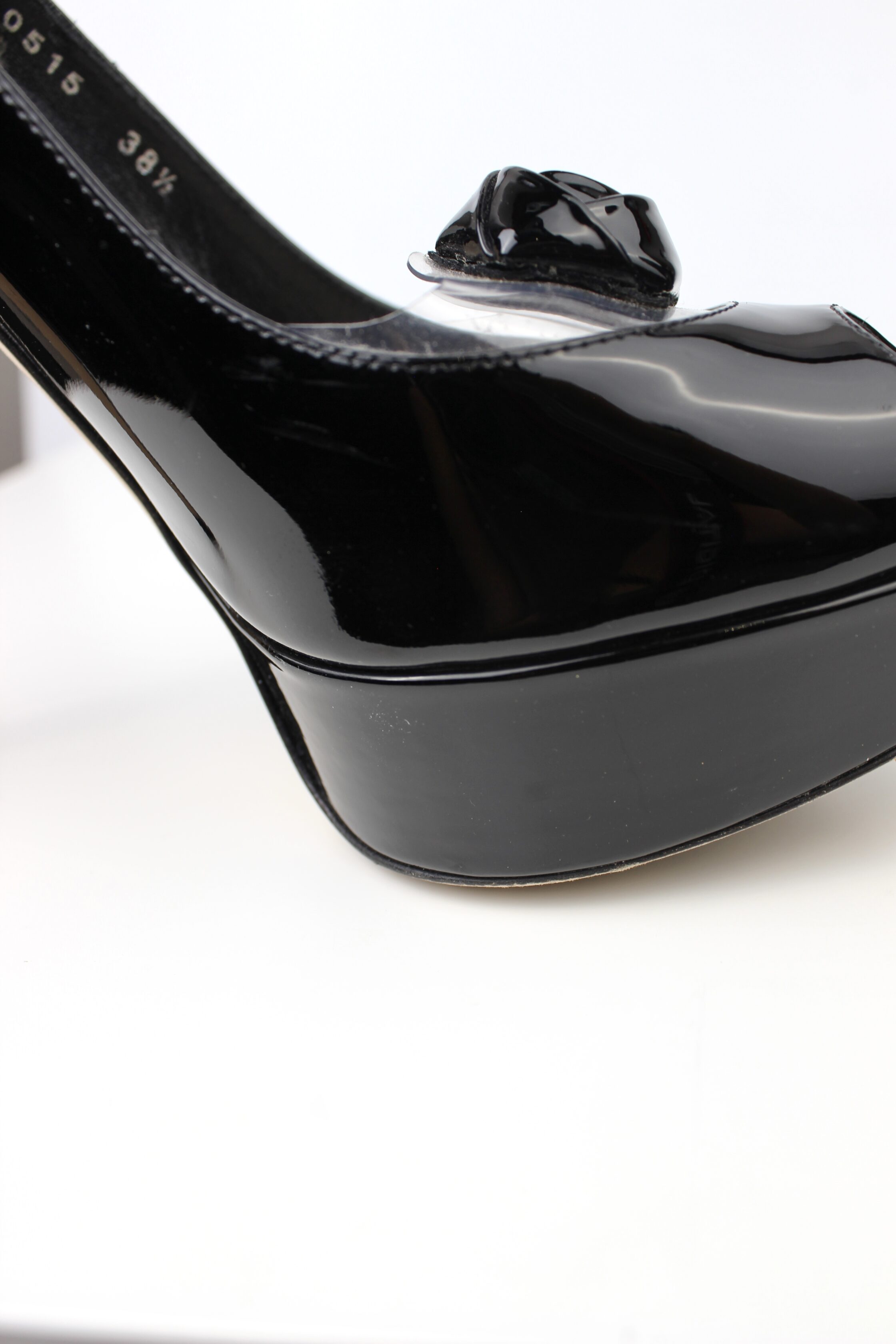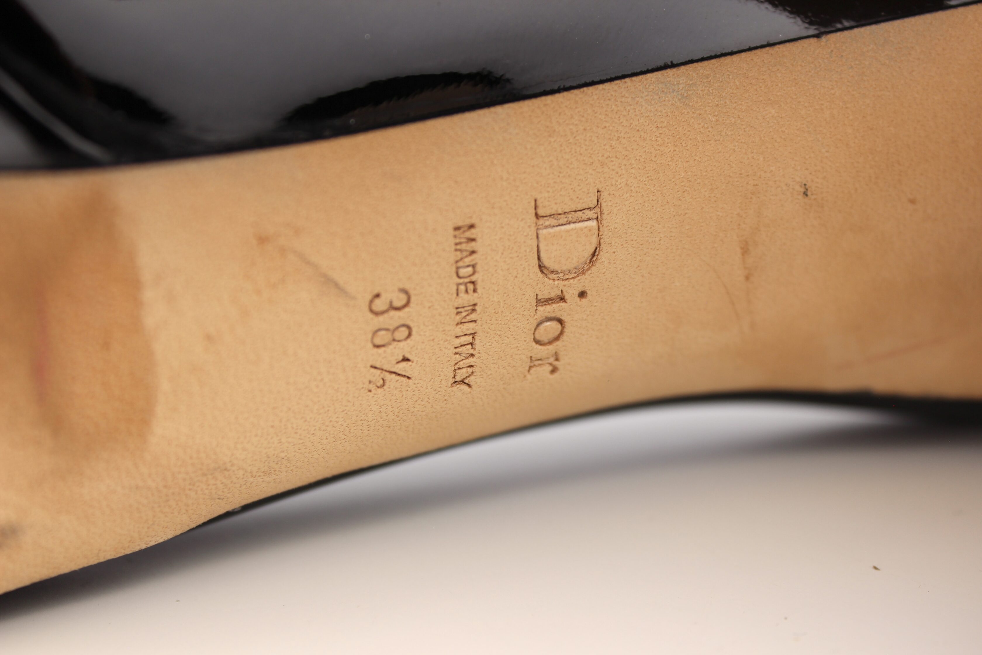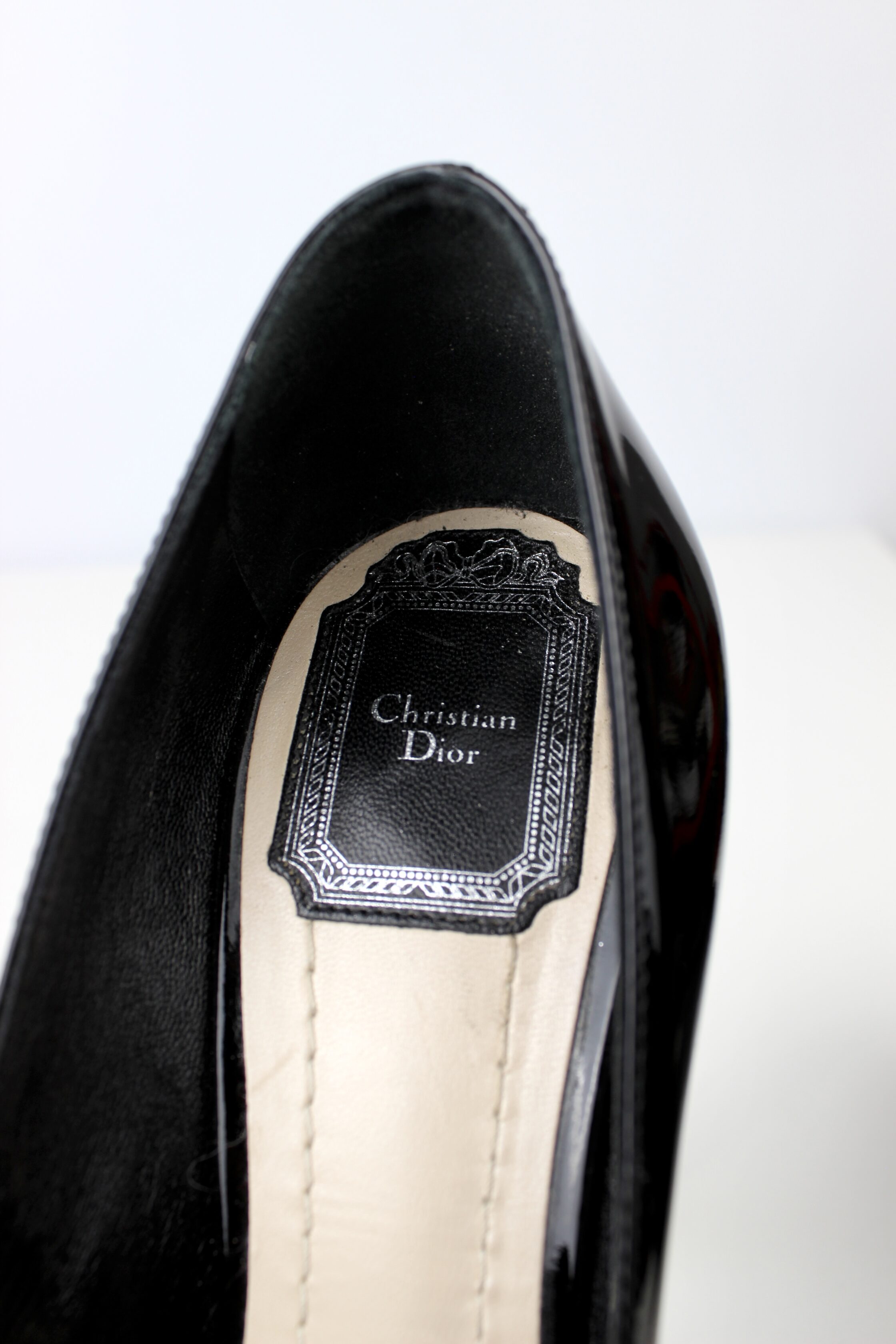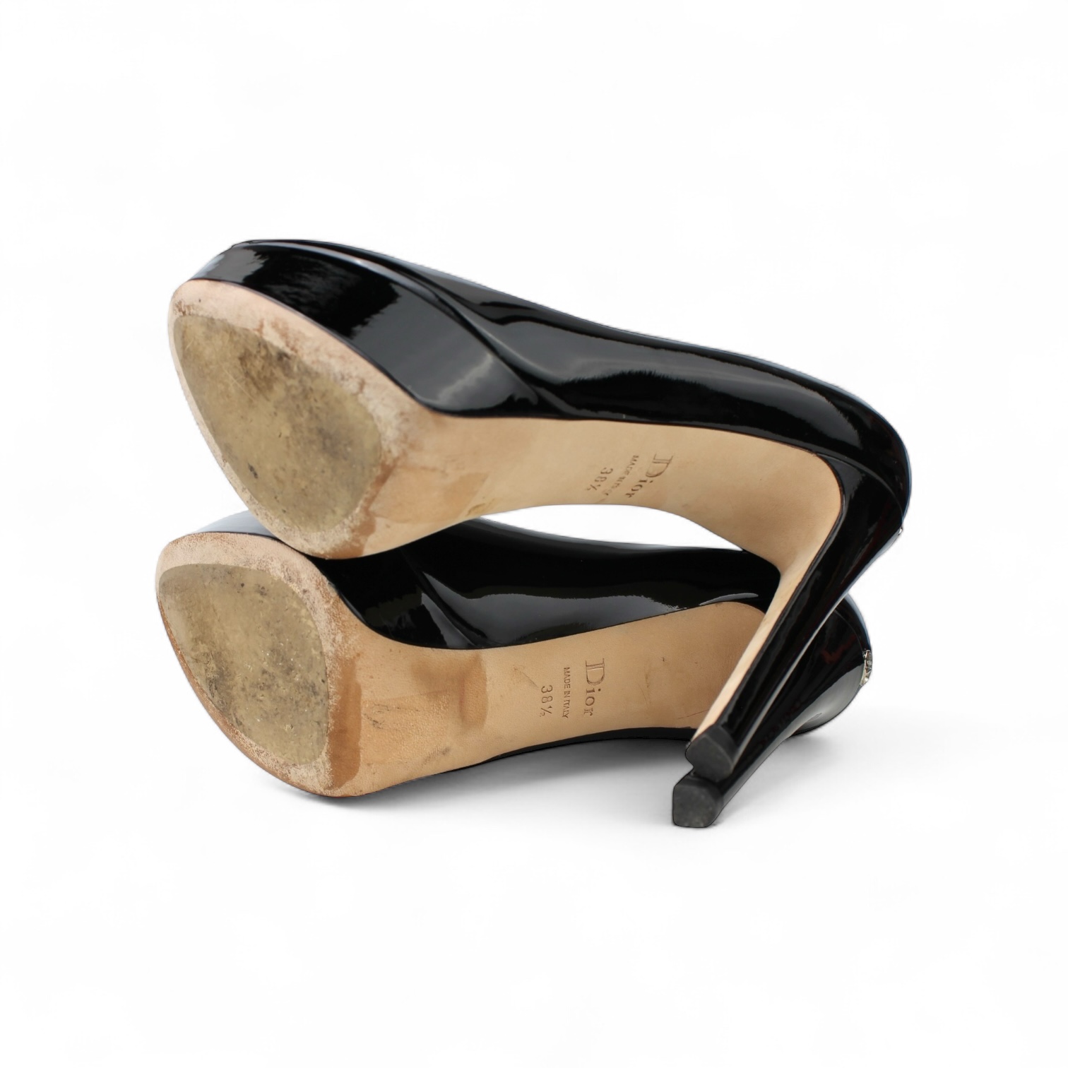 Escarpins Christian Dior en cuir verni noir, à bout ouvert (peep-toe) avec plateforme et talons hauts élancés. Ornés d’un petit détail en forme de fleur sur l’avant, ils allient élégance et féminité. Le cuir brillant apporte une touche sophistiquée, idéale pour une tenue de soirée ou une occasion habillée.