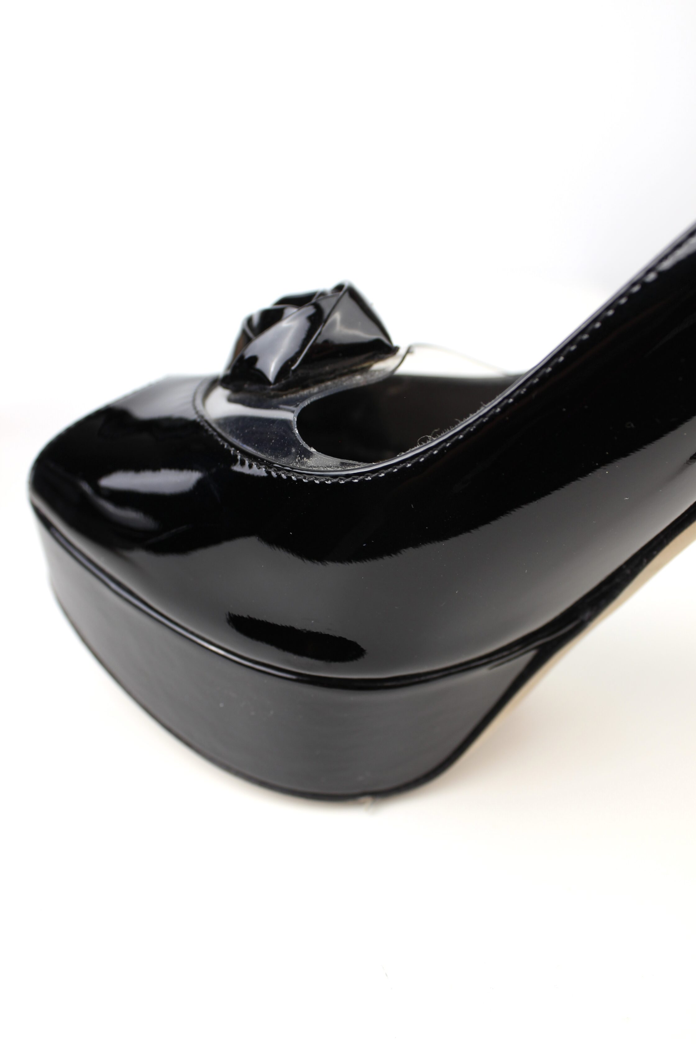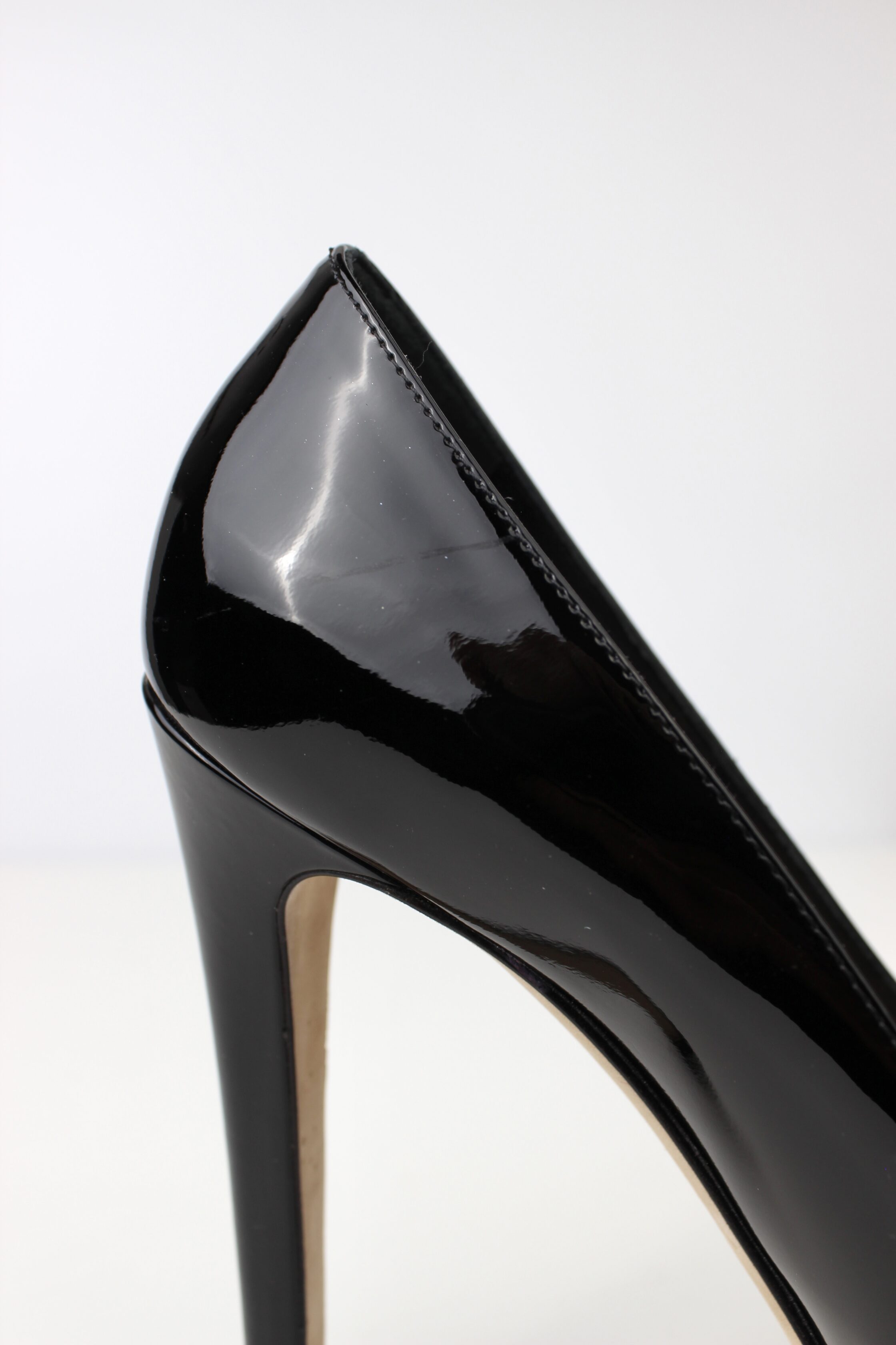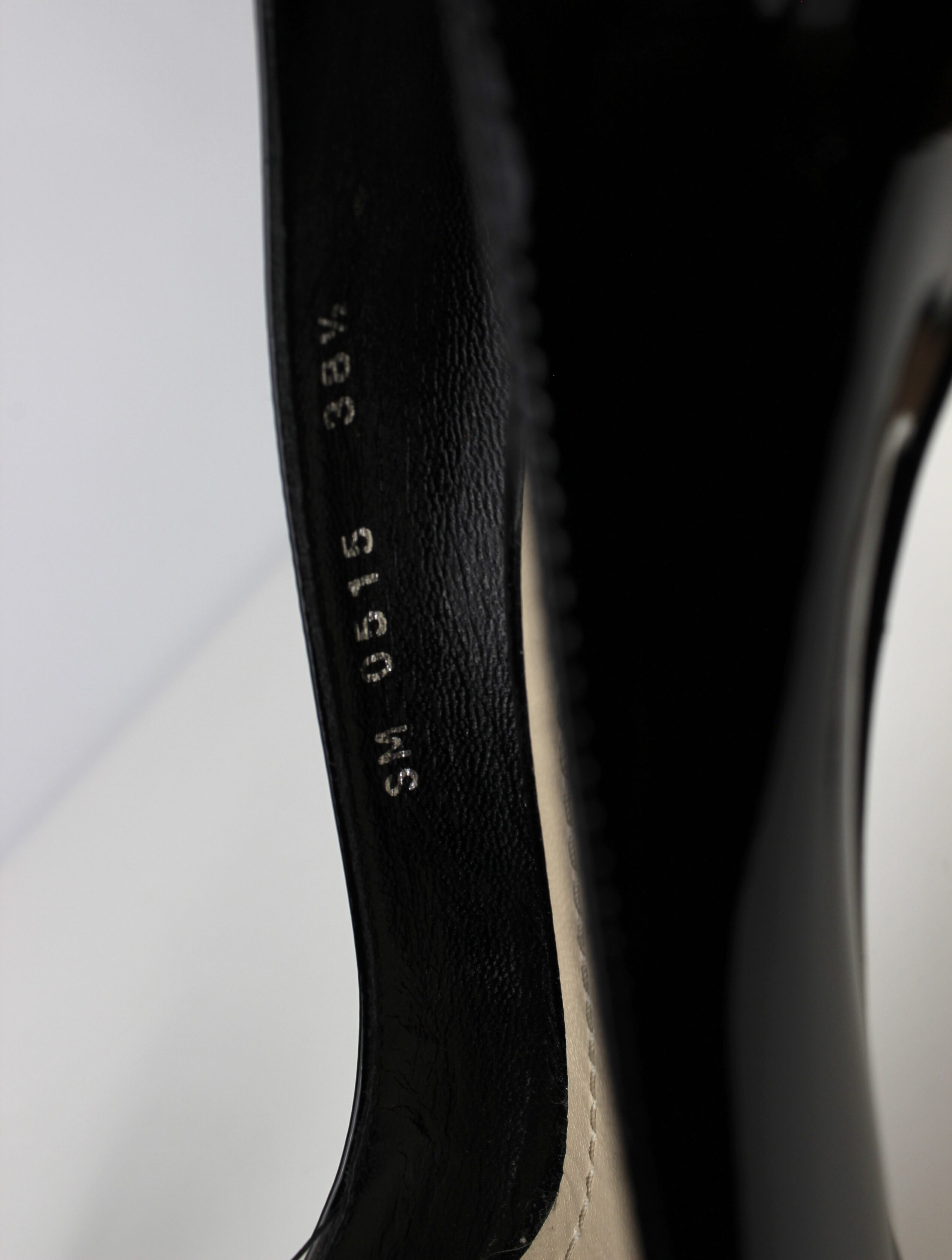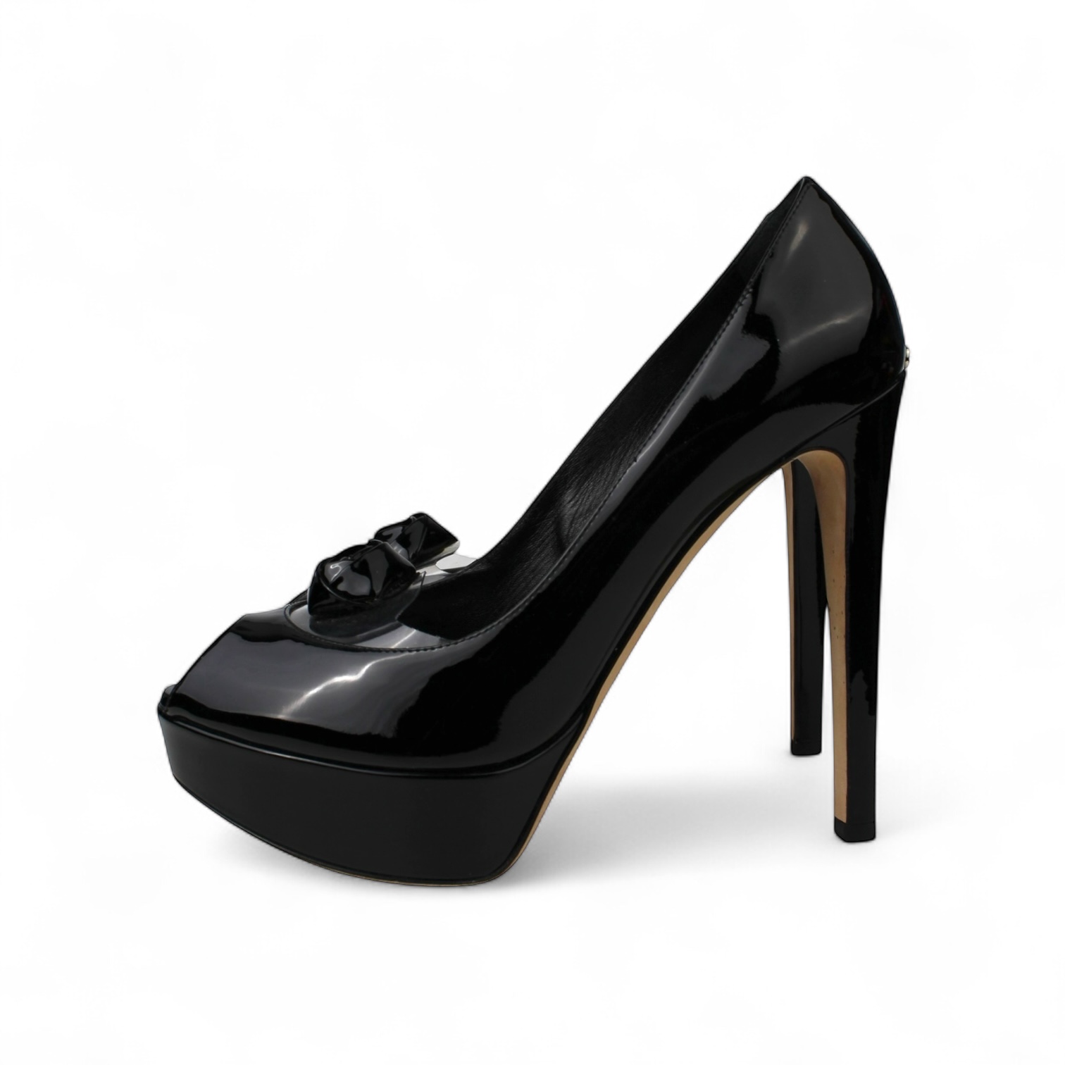 Escarpins Christian Dior en cuir verni noir, à bout ouvert (peep-toe) avec plateforme et talons hauts élancés. Ornés d’un petit détail en forme de fleur sur l’avant, ils allient élégance et féminité. Le cuir brillant apporte une touche sophistiquée, idéale pour une tenue de soirée ou une occasion habillée.