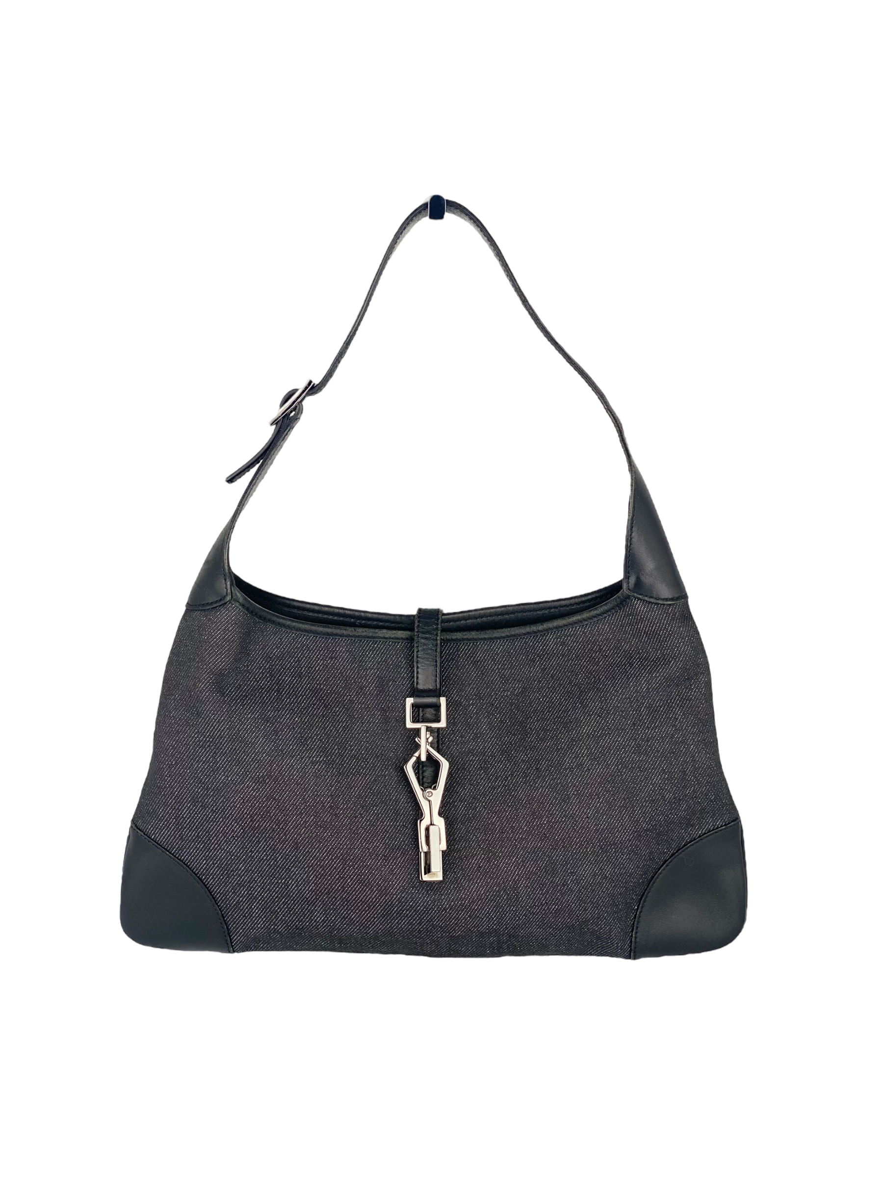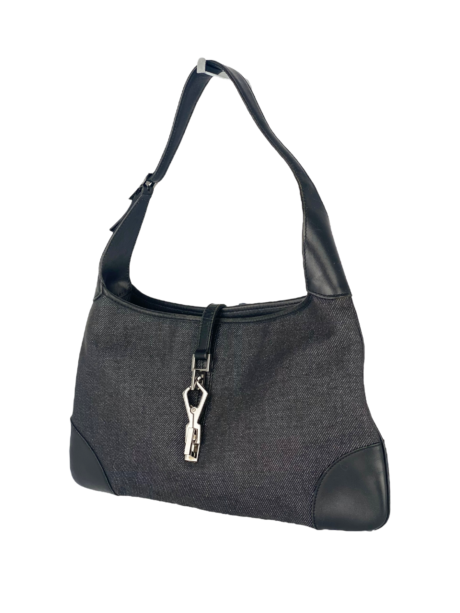Sac Jackie Gucci vintage confectionné en toile façon demin, cuir noir et finitions en métal argenté. Il est doté d’une anse pour un porté main ou à l’épaule. Modèle iconique et intemporel de la Maison Gucci. Un must-have à avoir dans son dressing pour les amateurs de vintage.