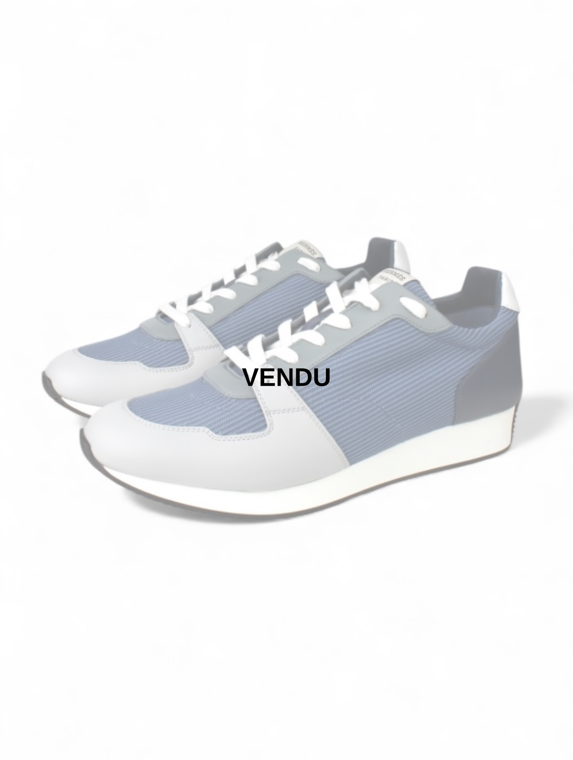 Sneakers Escape Hermès confectionné en mesh technique bleu et cuir de veau gris et bleu. Elles offrent une silhouette sportive et élégante, sublimée par des finitions impeccables typiques de la maison. Leur semelle légère et ergonomique assure un confort optimal au quotidien, tandis que leurs lignes épurées apportent une touche moderne et chic à toutes vos tenues.