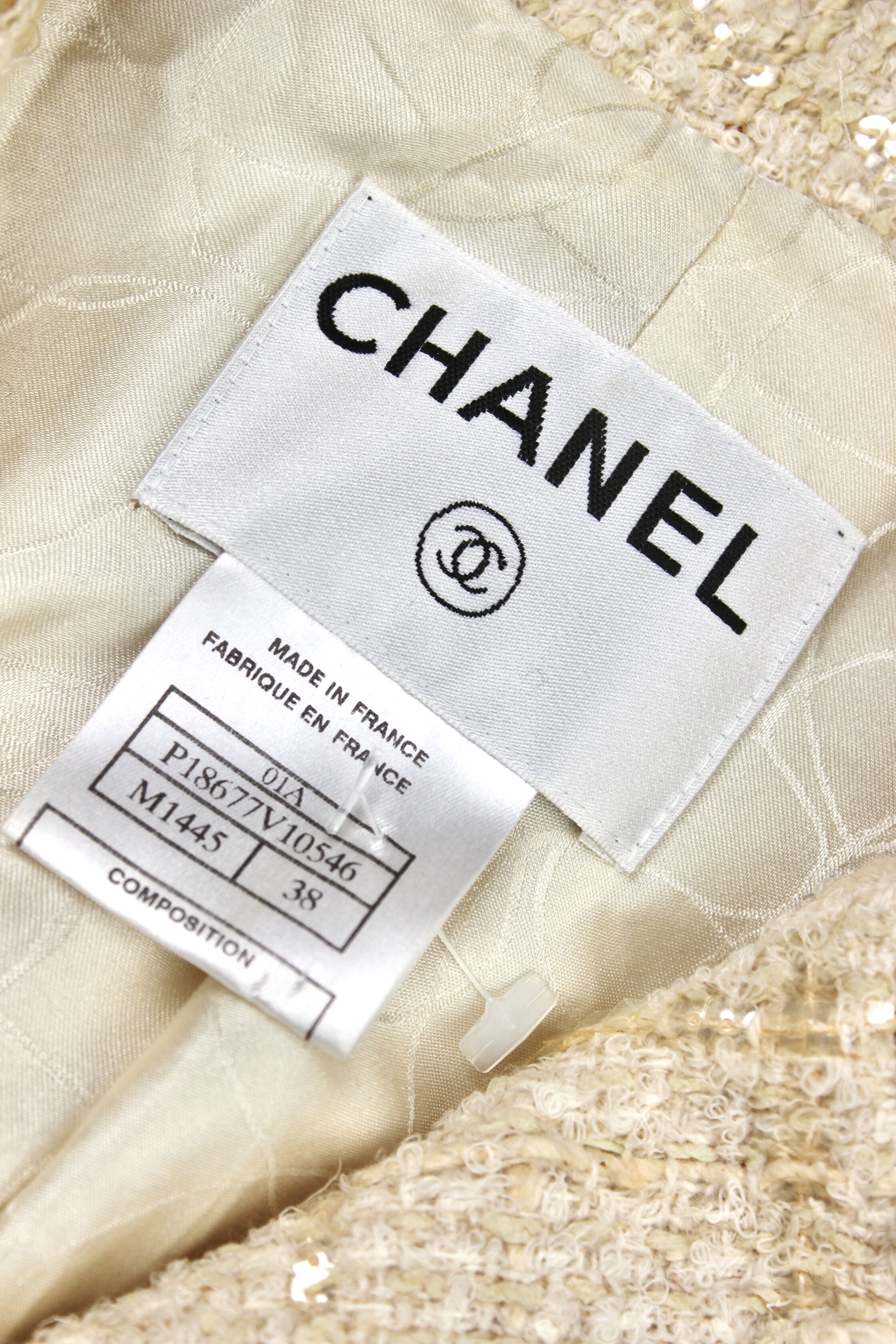 Cette élégante veste signée Chanel incarne le style classique de la maison de couture française. Confectionnée en tweed écru-beige, elle présente une silhouette cintrée et structurée, rehaussée de sequins discrets pour une touche de brillance subtile. Elle est dotée d’un col à revers cranté, de quatre boutons dorés emblématiques gravés du logo Chanel, et de manches longues. L’intérieur est entièrement doublé en soie, garantissant confort et raffinement. Une pièce intemporelle, parfaite pour une allure chic et sophistiquée
